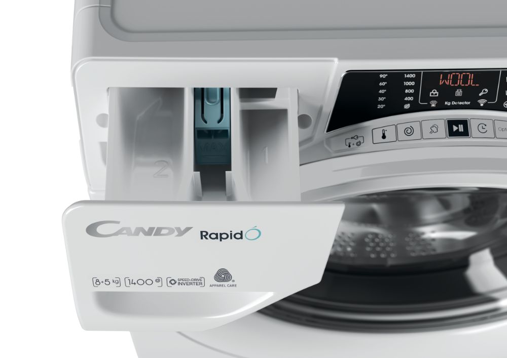 In stanga panoului de comanda Candy are un sertar special conceput pentru alimentare cu detergent solid lichid si balsam. Interiorul compartimentului pentru detergent a fost studiat pentru a evita pierderile si pentru a permite dozarea exacta atat a detergentilor lichizi, cat si a celor sub forma de pulbere. Scara gradata permite, astfel, reglarea cantitatii corecte si evitarea supradozarii.