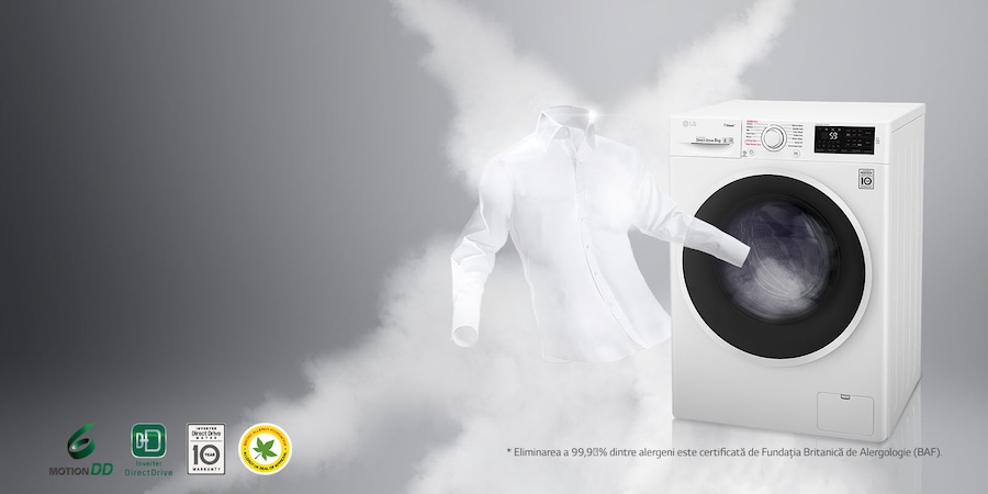 Acest model detine tehnologia True Steam ce ofera functiile Allergy Care, Reimprospatare cu aburi, precum si noua functie Steam Softener. Programul de reimprospatare este folosit pentru hainele curate ce au fost tinute mai mult timp in sifonier. Acest program foloseste aburul umed care scoate mirosul de statut din haine, la o sarcina maxima de 3 Kg. Tehnologia cu abur de la LG True Steam contribuie la eliminarea alergenilor in proportie de 99.9% si sterilizeaza bacteriile. Steam Softener este cea mai iginenica metoda de a pastra tesaturile moi. Acestea sunt pastrate moi numai cu ajutorul apei la temperaturii ridicate, fara surse chimice, deci este perfecta atat pentru copii, cat si pentru pielea sensibila. Prin functia Spa Steam din dotare acest model ofera materialelor un adevarat tratament SPA. Prin noua tehnologie acest model foloseste puterea aburului generat de un boiler ce, permite detergentilor sa actioneze in profunzimea materialelor si reuseste sa inlature petele si mirosurile neplacute. Aburii scot eficient urmele de cosmetice, ciocolata, uleiuri, unt, inghetata si deodorant. In plus cu functia Steam Antibacteria, distruge bacteriile printr-o sterilizare la 100°C, in cateva secunde. Materialele sensibile beneficiaza la randul lor de sterilizare, prin expunere la o temperatura mai mica de 100°C in schimb creste durata actiunii. Aceasta functie este folosit in timpul ciclului normal de spalare pentru a mari performantele de spalare, mentinand in acelasi timp o temperatura constanta in interior.