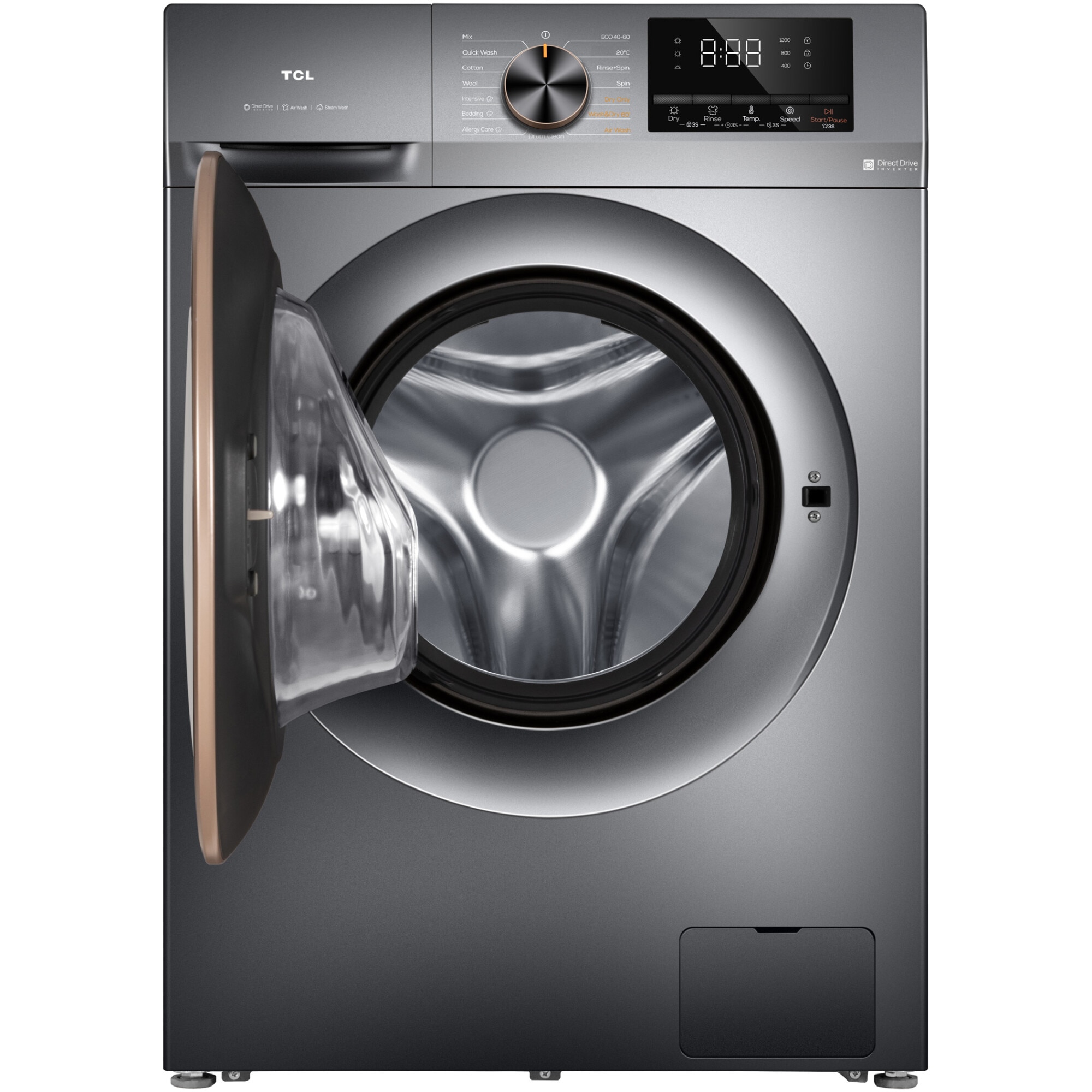 Masina de spalat rufe cu uscator TCL CP1012SA0 ce face parte din seria Direct Drive de la TCL este o alegere inspirata daca iti doresti o masina de spalat si de uscat performanta dotata cu tehnologii de ultima generatie si economica din punct de vedere al consumului de resurse energetice. TCL Industries Holdings Co. Ltd. este compania-mama a gigantului de tehnologic globala TCL, ce este specializata in dispozitive inteligente, si servicii inovatoare de internet, avand sub umbrela sa entitati majore: precum TCL Electronics (SEHK: 1070) si TCL Technology (SZSE: 000100), ce se ocupa cu inovatia in televizoare, electrocasnice, dispozitive mobile si tehnologii sustenabile, precum solutii de echipament pentru energia verde, deservind clienti din peste 160 de tari. Masina de spalat rufe cu uscator TCL CP1012SA0 produsa de aceasta firma are un design modern de culoare gri inchis cu ornamente auri la butonul rotativ si la hubou, potrivindu-se perfect intr-un spatiu destul de redus de numai (H, L, A) cm 85 x 59,5 x 62,8 cu o greutate neta de 70 Kg.
