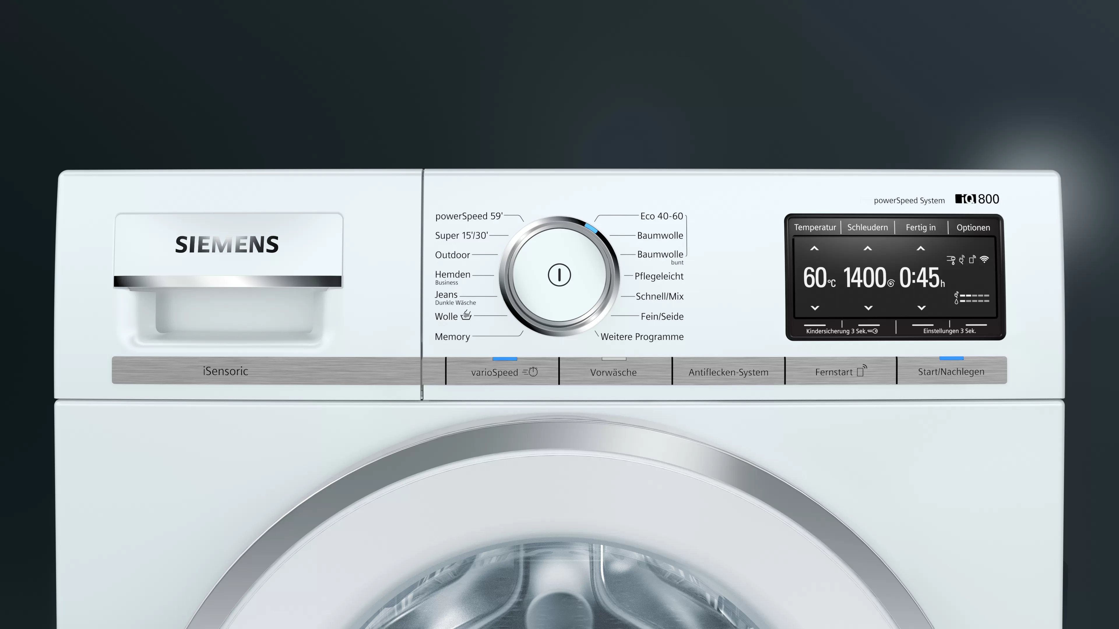 In dreapta selectorului de programare se afla un display cu afişaj LED cu text pentru o utilizare uşoară şi intuitivă cu actionari touch control cu functii de: Indicator de consum, dand informatii estimative privind consumul de apa si energie, amanare pornire de la 1 – 24 h, afisare timp ramas, selectare temperatura, selectare centrifugare. De asemenea se vor cunoaste etapele de spalare. Cu butonul On/Off care este actionat prin apasarea butonului rotativ pornim sau oprim masina de spalat. Cu tasta Anti Stain masina elimina 16 de tipuri de pete din 4 grupe principale: fructe (portocale, sos de rosii); organice (grasime, unt, oua, iarba), cafea (inclusiv ceai, iaurt de ciocolata, paste fainoase, machiaj). In plus acest program ofera un ciclu de spalare si de clatire mai indelungat, cu temperaturi de spalare ridicate, etape speciale de prespalare si un ciclu de clatire mai indelungat, asigurand astfel o curatare superioara a hainelor. Tasta Pre Wash este folosita daca rufele sunt foarte murdare. Cu butonul Mode prin apasari succesive, derulam functiile suplimentare. Prin accesarea functiei i-DOS 1 activam sau dezactivam sistemul inteligent de dozare detergent lichid. La aceasta functie putem sa reglam si cantitatea de detergent de baza. Prin accesarea functiei i-DOS 2 activam sau dezactivam sistemul inteligent de dozare balsam si detergent lichid. La fel si la aceasta functie se poate regla si cantitatea de balsam si detergent de baza. Cu functia 4D Wash System Intensive Plus se activeaza/dezactiveaza ciclul de spalare ce combina pulverizarea directa a apei asupra rufelor, cu spalarea suplimentara prin centrifugare. Aceasta optiune o putem activa pentru rufe deosebit de murdare. Cu tasta Finished setati timpul de spalare. Cu tasta Delay End puteti sa configurati, astfel ca masina de spalat sa porneasca automat mai tarziu; Cu tasta Spin alegem viteza de centrifugare; Iar cu tasta Temp stabilim temperatura de spalare. Prin accesarea functiei de Extra Rinse putem sa accesam si o clatire suplimentara a rufelor pentru a elimina in totalitate orice urma de detergent. Accesand functia Easy Ironing de calcare usoara permite rufelor sa aibe mai putine cute la finalizarea operatiunii de spalare din principalele programe. Acest program consta printr-o aerare si o viteza redusa de centrifugare. Prin apasarea tastei Speed Perfect, se activeaza functie de spalare intr-un timp mai scurt, dar cu consum energetic mai mare. Pentru un plus de confort aceasta masina de spalat rufe de la Siemens este dotata si cu tehnologia Confort Control, ce ne da posibilitatea utila de a vedea pe display consumurile de resurse energetice pentru fiecare ciclu de spalare selectat. In plus cu tehnologia Home Connect din dotare conectat in reteaua Wi-fi Conn@ct putem folosi aceasta functie pentru a controla masina de spalat rufe de ori unde. Cu aceasta aplicatie puteti verifica starea si controlul functiilor cu ajutorul smartphone-ului sau a unei tablete. Setarile sistemului Siemens @ home apar pe display numai atunci cand stick-ul de comunicare este introdus in aparat. Pentru a beneficia de aceasta aplicatie este nevoie sa consultati instructiunile de utilizare Siemens @ home. Pentru mai multe detalii cu privire la functiile Wi-Fi, este nevoie sa navigati prin modul Demo al aplicatiei. La acest model avem posibilitatea de a opri si apoi de a porni in timpul derulari unui program de spalare. Aceasta functie poate fi folosita si pentru a scoate sau a adauga rufe in masina de spalat. Pentru a realiza acest lucru comutam masina in modul Pauza in timpul unui program de spalare, apasand tasta “Pornire/Pauza” iar pe display un indicator ne va indica etapa in care a ajuns ciclul de spalare. Oprirea masinii pe durata unui ciclu de spalare nu este posibil daca apa din masina are temperatura mai mare de 50°C sau cand nivelul este prea ridicat. Oprind masina putem face si eventuale modificari ale functiilor auxiliare, ale temperaturii si a vitezei de centrifugare, daca este necesar. Pentru a reporni programul de spalare apasam in continuare pe aceeasi tasta “Pornire/Pauza”. Modificarile in programul de spalare vor fi facute cu conditia sa fie adecvate programului respectiv iar programul de spalare in derulare nu a fost inca finalizat. In cazul cand apar probleme tehnice, acest aparat afiseaza coduri de eroare, ce sunt explicate mai bine in cartea tehnica, intr-un tabel. Programul Child Lock permite blocarea butoanelor masinii de spalat pentru a preveni oprirea accidentala sau schimbarea programului. Copiii se pot juca langa masina de spalat, fara ca sa fie supravegheati permanent. Aceasta masina folosind o tehnologie avansata cu senzorii Active Water Plus, aparatul detecteaza in primul rand cantitatea de rufe in stadiul primar al ciclului de spalare. Astfel dupa detectarea cantitatii de rufe, aparatul regleaza automat durata programului de spalare. In plus functia de detectare automata a incarcaturii regleaza si consumul de apa pentru fiecare program in functie de tipul de tesatura si de cantitatea de rufe. Astfel la acest model pictograma senzorului de sarcina se aprinde cand selectati un ciclu care accepta detectarea sarcinii. Este posibil ca unele cicluri de spalare sa nu accepte detectarea sarcinii. Odata ce ati pornit ciclul de spalare, pictograma cu functia dedicata se aprinde intermitent sau continuu in timpul procesului de detectare a sarcinii si se stinge cand procesul se finalizeaza. In acest sens inainte de prima utilizare derulati functia de calibrare a masini de spalat. In primul rand verificati ca tamburul sa fie gol, apoi porniti masina de spalat, intrand in meniul de Calibrare. Iar in continuare va apare un mesaj vizual pe ecran „Cb” care va arata ca functia sa activat. Cand functia este activata tamburul se va roti in sens orar si antiorar timp de aproximativ 3 minute, iar la finalizarea ciclului, la fel va apare un mesaj vizual pe ecran „0” si masina de spalat se opreste automat. Din acest moment,
