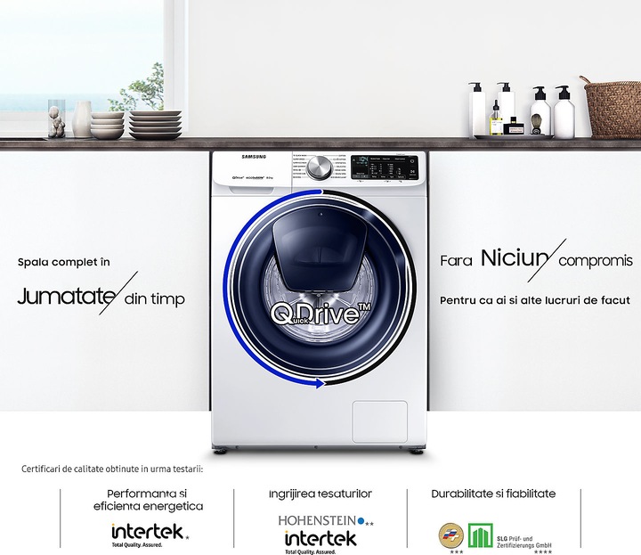 Functia Eco Drum Clean+ este un ciclul de curatare ecologica a tamburului, ce va inlatura resturile de detergent si elimina 99,9% din bacteriile urat mirositoare, fara substante chimice dure. Forta de frictiune a jetului puternic de apa si rotirea rapida elimina 99% si din murdaria de pe garnitura de cauciuc a usii. Atentionarea de igienizare apare pe ecranul principal o data la 40 cicluri de spalare. Samsung WW80M644OPW/LE fiind un model inteligent datorita senzorilor si a procesorului din dotare masina te anunta la fiecare 40 de spalari cand trebuie sa fie curatata. Acest model este echipata cu functia inovatoare Q-rator ce este o aplicatie de management al acestui model. Cu aceasta aplicatie iti poti folosi noua ta masina de spalat mai eficien. In sectiunea data de aplicatia Recomandari poti gasesti rapid ciclul optim de spalare pentru fiecare tip de material textil. La sectiunea Planificator aplicatia iti permite sa administrezi orele de finalizare ale ciclului de spalare pentru a-ti optimiza programul zilnic. Iar la functia Asistent procesorul identifica si ofera solutii pentru eventualele probleme aparute in timpul ciclului de spalare. Aplicatia Recomandari stocheaza datele, preferintele si modul de utilizare, pentru a sugera cele mai utile optiuni utilizatorului. Utilizatorul va fi unicul responsabil pentru eventualele daune cauzate masinii sau textilelor de informatii incorecte furnizate de catre acesta procesorului. Ciclul de spalare recomandat este bazat doar pe durata programului si poate sa nu fie potrivit pentru toate materialele sau tipurile de murdarire al articolelor ce sunt spalate. Pentru a beneficia de aceasta functie este necesar un cont in aplicatia Samsung si o conexiune WiFi, aplicatia care este disponibila pe dispozitive Android si iOS. Acest model cu funcţia de Memo a programul preferat datorita procesorului puternic stochează in memoria aparatului programele de spalare preferate si refolosite, atunci cand avem nevoie din nou de ele. Este suficient să apasam pe butonul de pornire şi sa repetam programul preferat si sa-l memoram.