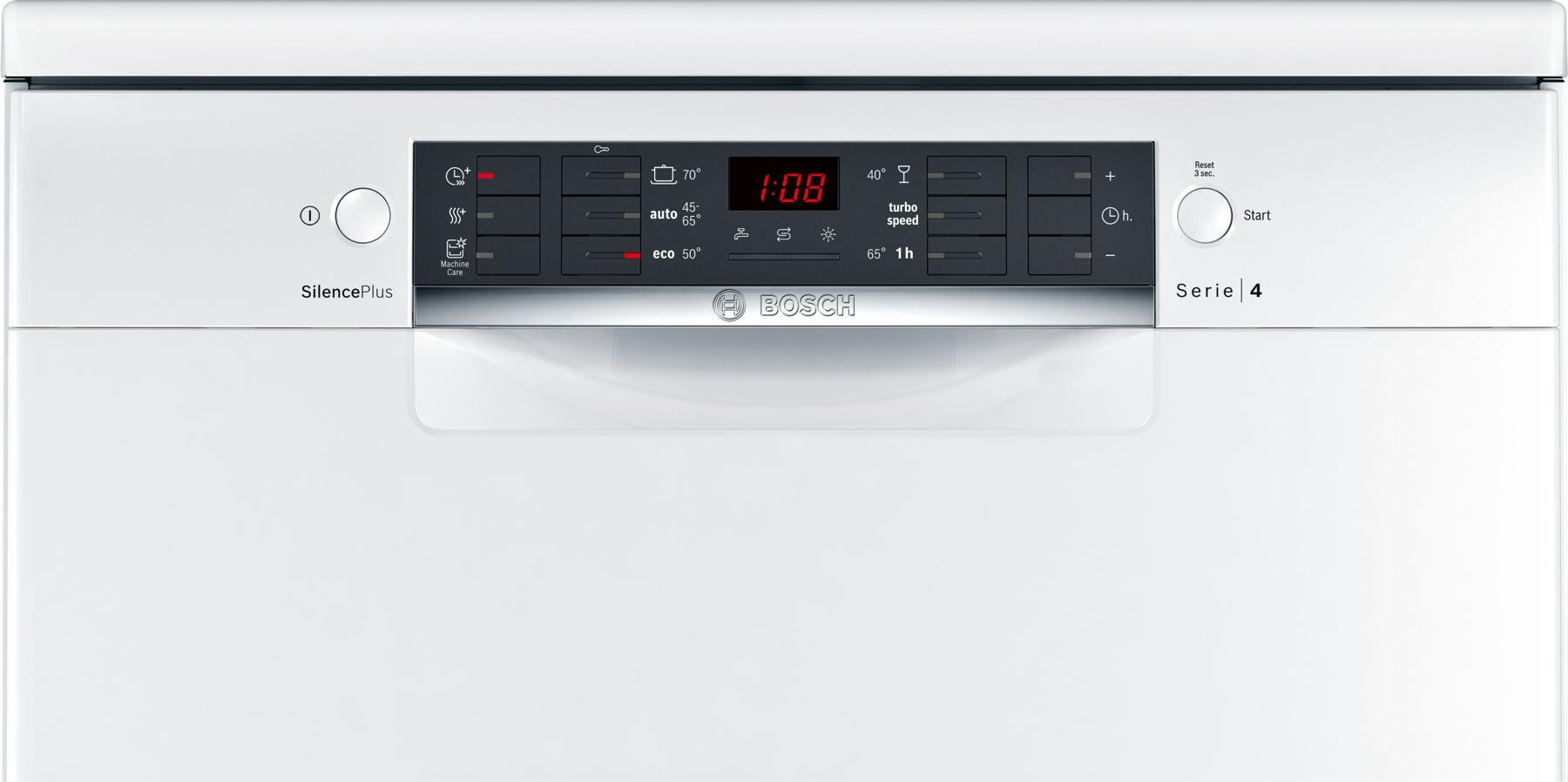 Masina de spalat vase Bosch SMS46KW00E seria 4 este alegerea perfecta daca iti doresti o masina performanta cu control mecanic dotat cu functii si tehnologii de ultima generatie. Mașina ce face parte din seria 4 lansata de Bosch are un design foarte simplu, având carcasa de culoare alb. Panoul cu control electronic are un display cu ecran LED, fiind plasat sus pe corpul masini. Panoul de comanda are un selector de programe cu butonul Start integrat si un numar redus de butoane cu actionari senzitive ce iti indica pe ecranul cu 7 segmente: timpul ramas pana la finalizarea programului, indicator pentru verificarea alimentarii cu apa, buton pentru deschiderea usi, buton pentru clatire suplimentara, indicatorul de umplere cu saruri, indicatorul de umplere cu agent de clatire, evacuarea apei precum si extra uscare. Aparatul are in dotare si functia Timer cu pornire intarziata pana la maxim 24 h cu afisare timp ramas. Programul Child Lock permite blocarea butoanelor masinii de spalat vase pentru a preveni oprirea accidentala sau schimbarea programului.