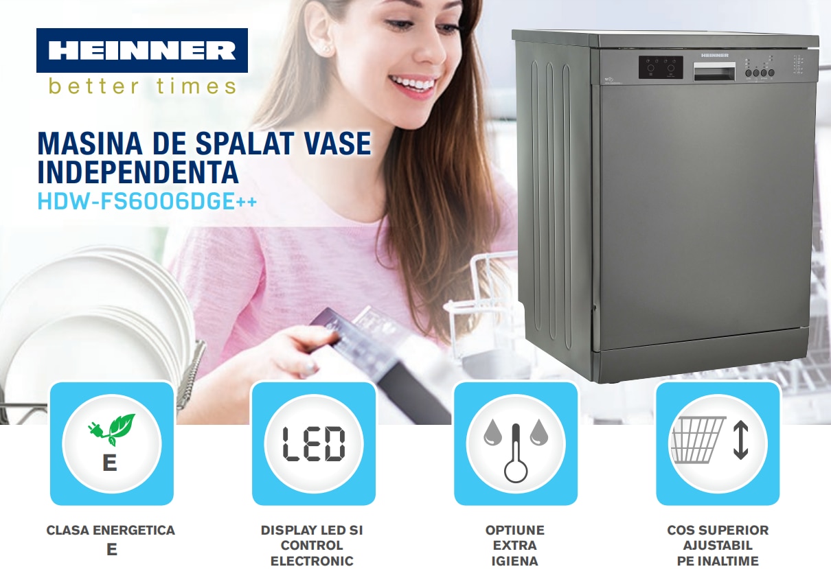 Consumul real de energie depinde de conditiile de utilizare ale masini. Masina de spalat vase este si foarte silentioasa, nivelul de zgomot are o valoarea de maxim 52 dB si asta datorita motorului asincron dotat cu un sistem de suspensi inbunatatit. La terminarea programului sunt anuntat ca ciclul a luat sfarsit printr-un indicator luminos regasit in partea superioara, alaturi de panoul de comanda si afisajul LED. Heinner HDW-FS6006DGE++ se închide dupa perioade lungi de inactivitate cu un consum de 0,5 W/h si functionand in modul stand-by cu 1 W/h pentru a economisi energie electrica. Oprirea automata se produce dupa 5 minute de inactivitate. Pentru a accesa si un alt produs ce face parte din categoria electrocasnice si doriti sa aflati mai multe informatii tehnice, scrieti in spatiul Search din dreapta sus, produsul pe care doriti sa-l achizitionati, sau din ce categorie face parte; De exemplu: aer conditionat, combina frigorifica, masina de spalat etc. si motorul de cautare va prezenta produsul cautat sau asemanator din baza directa de date.
