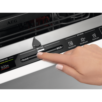 Panoul cu text/simboluri ascuns are o interfata foarte simpla, fiind prevazut cu un numar redus de butoane touch control si afișaj LCD are un: indicator pentru agentul de clatire, indicator de reumplere a sarii, indicator pentru ajutor de clatire, sare, faza de uscare, sfarsit program, faza de timp, extra igienizare, selectie programe, clatire suplimentara, Rinse phase, faza de spalare, Xtra Dry, precum si etapele de spalare. Aparatul este dotat si cu Timmer cu optiune de pornire intarziata de la 1 la 24 ore. In plus panoul de comanda are in dotare si tehnologia Quick Select de la AEG ce asigura setari optime pentru fiecare ciclu de spalare a vaselor. In acest sens alegeti durata ciclului si eventualele programe de spalare optionale si cu ajutorul unui buton glisor pe bara de selectare My Time. Cu ajutorul glisorului puteti selecta un ciclu de spalare in functie de durata, care variaza de la minim 30 de minute la maxim 4 ore. In plus un indicator Ecometer arata numele si durata de la programul de spalare ales; Durata pornirii cu intarziere; Texte cu informatii care indica modul in care selectarea programului de spalare afecteaza consumul de resurse energetice. Cu cat sunt aprinse mai multe bare luminoase, cu atat este mai redus consumul. Cand glisorul ajunge in pozitia ECO acest lucru ne indica selectarea programului de spalare care este cel mai prietenos cu mediul. Cu sectiunea Extras cu 3 butoane touch control puteti selecta si regla un ciclu de spalare. Prin apasarea butonului touch control Extra Silent functia permite reducerea zgomotului generat de masina. Acest program este adecvat utilizarii pe timp de noapte, unde pompa de spalare functioneaza silentios si la o viteaza redusa. Ca urmare a reduceri parametrilor de functionare durata programului de spalare este mai mare. Optiunea Extra Power amelioreaza rezultatele de spalare in programul de spalare selectat. Accesand aceasta optiune se va mari temperatura si durata de spalare in programul de spalare selectat. Prin apasarea butonului touch control Glass Care asigura o ingrijire spaciala pentru tacamuri si vase sensibile la temperatura. Prin apasarea butonului touch control Auto regleaza automat ciclul de spalare in functie de tipul de vase din masina. Indicatorul Machine Care este aprins cand masina de spalat are nevoie de o igienizare interna. Iar indicatorul fazei de Uscare este aprins cand este selectat un program de spalare ce are inclus si o faza de uscare. Semnalizarea clipeste cand faza de uscare se deruleaza. Indicatorul Delay Start se aprinde cand setati pornirea cu intarziere. Indicatorul de Pauza clipeste cand puneti in pauza un ciclu de spalare, sau numaratoarea inversa cand se deschide usa masini. Functia de autodiagnosticare este si ea foarte utila deoarece este menita sa iti furnizeze prin coduri de eroare, informatiile potrivite atunci cand apar erori in programare sau chiar functionare oferindu-ti solutii la erorile de functionare.