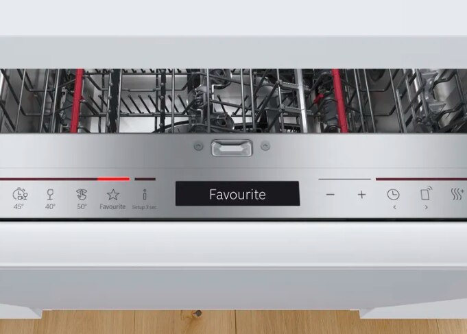 Iar panoul de control al acestui model este ascuns sus pe usa masini. Astfel panoul de control are o interfata foarte simpla, fiind prevazut cu un numar redus de butoane cu pictograme cu semnalizari cu LED-uri ce te indruma in programele de spalare ale masini, indicator cu functia incarcare la jumatate, cu indicator de sare, indicator de umplere a agentului de clatire etc. Masina de spalat vase Bosch SMV4ECX16E are in dotare si functia Timer cu pornire intarziata pana la maxim 24 h cu afisare timp ramas. Aceasta optiune iti permite sa utilizezi masina in mod confortabil, la orice ora in timpul zilei, in timpul orelor de lucru sau in timpul noptii. Cu tasta Efficient Dry accesam functia de uscare cu ajutorul curentilor de aer. Cu tasta Speed Perfect+ reducem durata de spalare, la toate programele de spalare in afara de programul Express cu durata de 1 ora. In schimb consumul de resurse energetice se mareste. Cu tasta Machine Care activam functia de igienizare al cuvei. Cu tasta 1/2 activam functia de spalare cu incarcare la jumatate. Cu tasta Start pornim programul de spalare. Cu tasta Favourite aveti posibilitatea de a salva o combinatie dintre un program de spalare si o functie suplimentara. Aceasta salvare a programului de spalare preferat se face direct din aparat sau prin intermediul aplicatiei Home Connect.