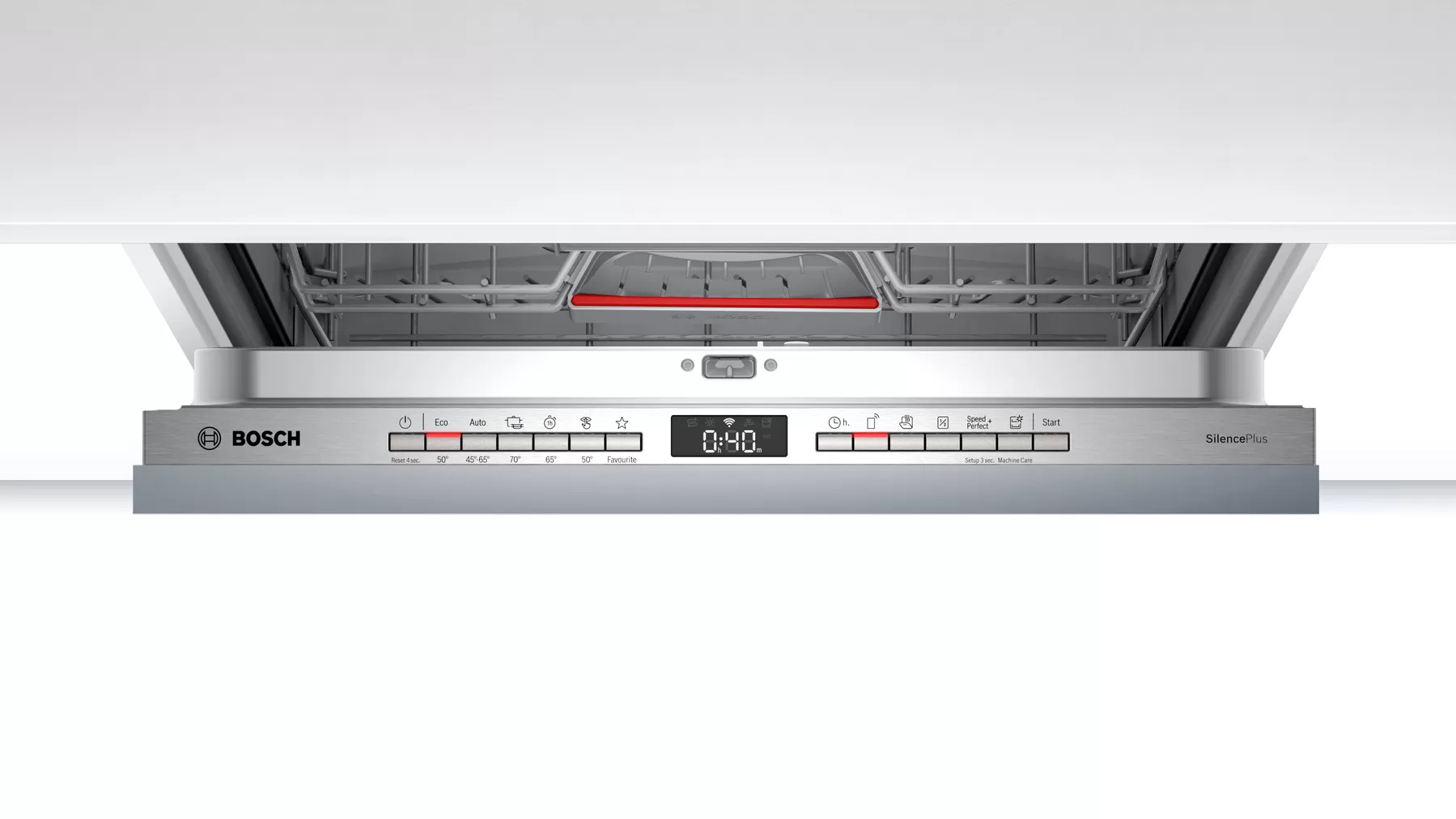 Iar panoul de control al acestui model este ascuns sus pe usa masini. Astfel panoul de control are o interfata foarte simpla, fiind prevazut cu un numar redus de butoane cu pictograme cu semnalizari cu LED-uri ce te indruma in programele de spalare ale masini, indicator cu functia incarcare la jumatate, cu indicator de sare, indicator de umplere a agentului de clatire etc. Masina de spalat vase Bosch are in dotare si functia Timer cu pornire intarziata pana la maxim 24 h cu afisare timp ramas. Aceasta optiune iti permite sa utilizezi masina in mod confortabil, la orice ora in timpul zilei, in timpul orelor de lucru sau in timpul noptii. Cu tasta Efficient Dry accesam functia de uscare cu ajutorul curentilor de aer. Cu tasta Speed+ reducem durata de spalare, la toate programele de spalare in afara de programul Express cu durata de 1 ora. In schimb consumul de resurse energetice se mareste. Cu tasta Machine Care activam functia de igienizare al cuvei. Cu tasta 1/2 activam functia de spalare cu incarcare la jumatate. Cu tasta Start pornim programul de spalare. Cu tasta Favourite aveti posibilitatea de a salva o combinatie dintre un program de spalare si o functie suplimentara. Aceasta salvare a programului de spalare preferat se face direct din aparat sau prin intermediul aplicatiei Home Connect. Programul Child Lock permite blocarea butoanelor masinii de spalat vase pentru a preveni oprirea accidentala sau schimbarea programului. Copiii se pot juca langa masina de spalat vase, fara ca sa fie supravegheati permanent. Aceasta masina fiind proiectata pentru o functionare indelungata pe afisaj vor aparea si coduri de eroare. In acest sens cu functia de Diagnosticare Inteligenta din dotare acest model are rolul de a preveni defectiunile severe care pot sa apara. Aceasta functie va identifica inca din faza incipienta orice eroare aparuta in regimul normal de functionare si va opri instantaneu masina de spalat, afisand in acelasi timp pe display-ul acesteia un cod specific fiecarei erori. In functie de aceste coduri afisate ce sunt prezentate si in manualui masini, veti putea gasi cele mai rapide si mai sigure metode de remediere. Cu tasta Info puteti obtine informati prin afisare la programele suplimentare de spalare. Iar cu ajutorul aplicatiei Manager, acest model va porni automat in intervalul de timp setat, folosind cea mai rentabila oferta de consum de exemplu: noaptea sau cand folositi o sursa alternativa fotovoltaica. Masina de spalat vase Bosch detine optiunea Half Load, unde timpul de spalare este redus cu mai mult de jumatate, iar rezultatele la spalare şi uscare se mentin optime. Acest sistem genereaza economii de timp de pana la 66%. Aceasta optiune poate fi folosita in toate programele de spalare in afara de programul de spalare cu durata de 1 ora. Cu tehnologia Home Connect din dotare conectat in reteaua Wi-fi Conn@ct putem folosi aceasta functie pentru a controla aparatul de ori unde. Cu aceasta aplicatie activat prin intermediul WLAN/Wi-Fi puteti verifica starea si controlul functiilor cu ajutorul smartphone-ului sau a unei tablete. Aceasta tehnologie poti sa o folosesti cu functie Easy Start, ce necesita sa introduci in aplicatia Home Connect: gradul de murdarire, tipul si cantitatea de vase sau de tacamuri in programul de spalare. Astfel, poti alege usor programul de spalare potrivit, cu rezultate bune de spalare. Optiunea Flex Start din Home Connect iti permite sa folosesti masina de spalat vase in modul cel mai eficient. In acest sens aplicatia de gestionare a energiei va utiliza apoi automat cea mai optima sursa de energie disponibila: La reteaua electrica sau la sistemul fotovoltaic.