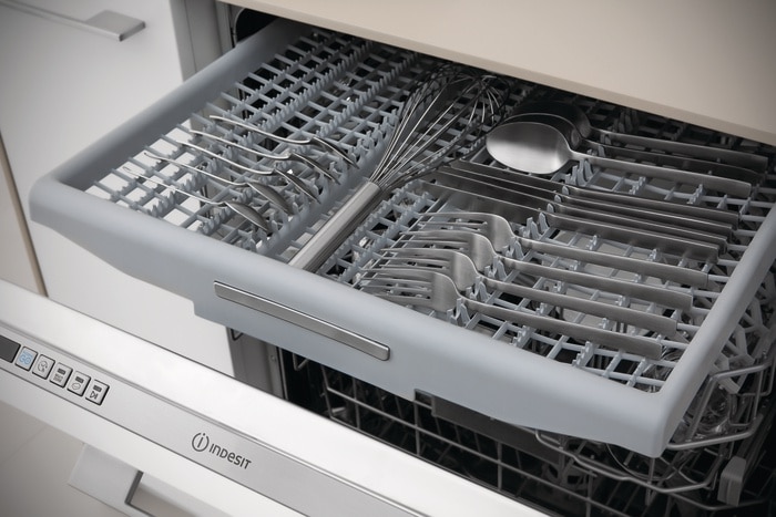 Masina de spalat vase incorporabila Indesit DIO3T131AFE, 14 seturi, 9 programe, Clasa D, Fast&Clean, Push&Go, Auto Door, Sertar tacamuri, Semnal luminos, 60 cm