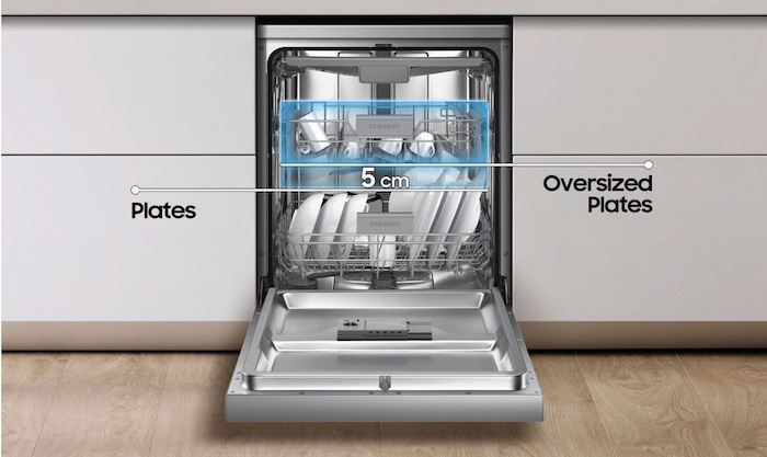 Samsung avand un motor Pro Smart Invertor fara perii cu puterea de 85 W asigura un cuplu de pornire suficient de mare; posibilitatea frânării rapide a motorului; importante economii de energie electrică; protecţie suplimentară a motorului (termică, la sub şi supratensiune, punere la pământ, scurtcircuit, calare rotor etc). In timpul functionarii la sarcina partiala (30-45 Hz), eficienta motorului creste considerabil in raport cu motoarele de curent alternativ existente in prezent, ce asigura o functionare ultra-silentioasa de 44 dB. Toate aceste avantaje sunt dublate de durabilitatea si robustetea ansamblului din care au fost eliminate elementele supuse uzurii, periile de carbon. Acest model pentru o rezistenta sporita, dar si pentru un nivel de igiena ridicat, cuva este facuta 100% din otel inoxidabil. Tot procesul de uscare al vaselor se face prin condensare, apa fiind colectata in cadrul unui rezervor cu indicator de nivel, avand capacitatea de 5 litri care trebuie golit la o anumita perioada de timp. Samsung este dotat cu Load Sensor, recunoaste nivelul de apa si viteza de rotatie. Pentru incarcaturi mai mari ale masini, este necesara o cantitate de apa mai mare pentru inmuierea vaselor iar nivelul de apa scade. In acest caz, se adauga mai multa apa. Pentru incarcaturi mai mici, este necesara o cantitate mai mica de apa pentru clatire. Senzorul de incarcare asigura utilizarea optima a apei, economisind apa si energie. Astfel functia de setare a sarcini la jumatate, ofera o flexibilitate mult mai mare, deoarece iti permite sa introduci si sa cureti vase numai in zona inferioara. Folosind aceasta tehnologie poti economisi timp si energie la spalarea unor cantitati mai mici si te poti bucura de confortul de a avea mereu vase curate la indemana. La acest model apa este pre-incalzita in rezervorul de clatire pentru a se evita socurile termice. Pre-incalzirea se face intr-un schimbator de caldura ce trateaza paharele si portelanul pretioase cu deosebita grija si fara riscuri. Masina de spalat vase este dotata cu 2 nivele de spalare cu un brat pulverizator mai robust plasat in partea inferioara a masinii de spalat vase. Acest model cu 2 brate de spalare la mijloc si jos are 5 variatii de presiune ale apei si asigura apei o acoperire maxima a intregii incarcaturi. Bratul stropitor de jos tip elice are o mișcare de rotatie dubla, cu schimbarea continuu a unghiului de pulverizare, pentru a ajunge in fiecare colt al masinii de spalat vase. In cazul fluctuatiilor de presiune al apei sau a ruperii conductei de alimentare, acest model are si sistemul Aqua Stop care blocheaza imediat intrarea apei in masina inchizand robinetul, iar masina se va opri.