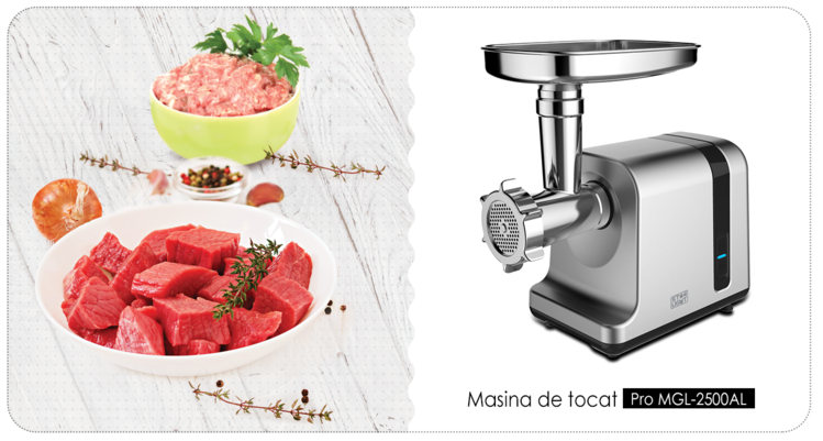 Masina de tocat Star-Light Pro MGL-2500AL este alegerea perfecta daca iti doresti o masina de bucatarie completa care sa iti ofere ajutorul de care ai nevoie atunci cand gatesti. Masina este dotat cu o multitudine de ustensile solide din inox alimentar si plastic dur, pentru o experienta a gatitului cat mai profesionista. Acest model cu configuraţie compactă din inox de culoare negru/inox, iese de asemenea in evidenta prin tehnologia avansata pe care se bazeaza, si care ii asigura performante inalte la prepararea diferitelor alimente din bucatarie, cu cel mai mic consum posibil. Iar panoul de comanda cu buton basculant On/Off cu schimbatorul de sens rotatie aparat cu functia Reverse, pozitionat pe carcasa motorului, cu control mecanic, indeplinesc functiile de: Tocare a fructelor si legumelor; Tocare a alimentelor din carne. Utilizarea functiei Reverse este interzisa in timp ce masina de tocat carne este in functiune. Inainte de a folosi acesta functie, opriti aparatul si asteptati cel putin un minut pana cand motorul se va opri complet. Functia Reverse este folosita atunci cand aparatul este blocat cu resturi de carne cu tesut mai dur, care se pot prinde in cutitul tocatorului. De asemeni, aceasta optiune este eficienta si pentru a goli masina dupa incheierea procesului de tocare, fara a permite risipa de alimente. In plus un LED de semnalizare ne indica modul de functionare al masini. Carcasa acestui model are si un comutator de conectare accesori cu functie de blocare la aparat. Controlul si functionarea acestui aparat este foarte simpla; Se conecteaza accesoriul cu functia dedicata la aparat si se apasa pe butonul de pornire. Cu functia de tocat carne, aparatul este un ajutor de nepretuit in bucataria noastra. Această interfaţă cu actionare clasica, oferă acces direct la functionarea masini de tocat in bune conditii si maxima securitate. Masina de tocat Star-Light Pro MGL-2500AL are o putere nominala de 2500 W. Cu aceasta masina cu o singura viteza, este suficient pentru a executa numeroase operatiuni in conditii optime. Sistemul de cuplaj al acestui model este complet metalic, fiind conceput sa reziste la regim de tocare de mare putere.