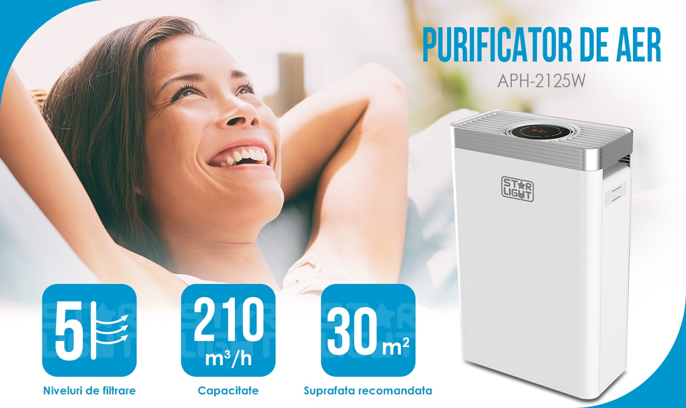 O varianta inspirata de purificator de camera este si purificator de aer Star-Light APH-2125W, fiind creat pentru a purifica aerul in mod profesional din camere cu spatiu mai restrans. Aparatul este echivalentul unui ventilator stationar, deoarece are un design specific, incluzand o unitate de ventilare a aerului, care isi permite sa extraga si sa disperseze aerul pe toata suprafata in spatiul unde este amplasat. Iar din punct de vedere constructiv, acest dispozitiv ne ajuta sa economisim mai mult spatiu, putand fi plasat in colturile unei incaperi. In acest scop urificatorul de aer stationar avand o carcasa din plastic ABS si o baza de sprijin patrulatera, are un design modern de culoare alb mat incadrandu-se perfect in locuinta noastra. Iar fluxul de aer generat de ventilator in sus este multi-directional, avand un orificiul tip grila ce este amplasat pe partea superioara a unitatii pentru a distribui aerul curat in incapere.