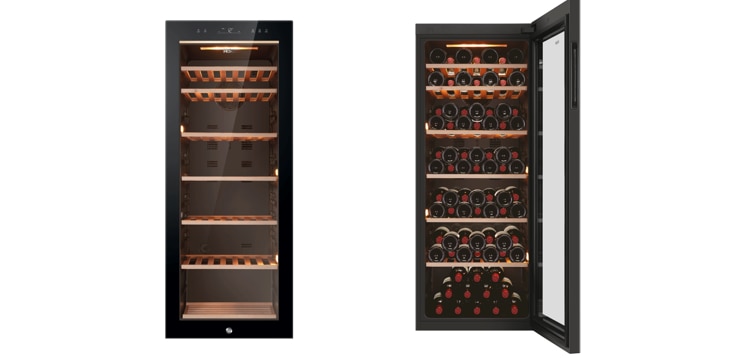 Partea buna la acest model, e ca rafturile nu sunt limitate in inaltime, acestea putand fi reglate astfel incat la interior sa incape si sticle de dimensiuni mai mari sau mai mici. Rafturile sunt reprezentate de 7 grilaje din lemn de fag tratat ce urmaresc canalele laterale. Primele 6 rafturi destinate pentru depozitarea de sticle in pozitia orizontala sunt usor de scos, prin tragere in afara.