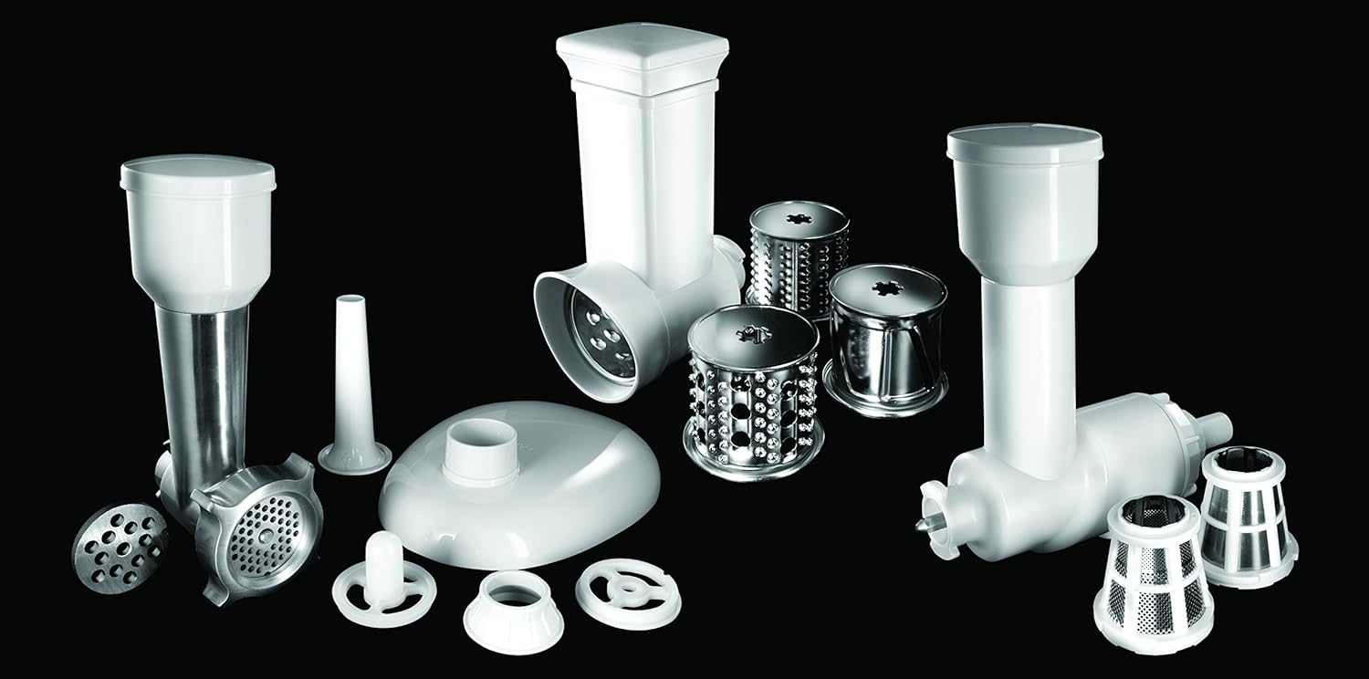 Cu masina de tocat carne pe care o atasam robotului, vei putea pregati de exemplu 2 kg de carne pentru sarmale, in doar 10 minute. Tocatorul fiind echipat cu site puternice din otel, va va ajuta sa pregatiti plăcinte de casa, carnati, kebbe si umpluturi fara efort. Tocatorul are in dotare doua site standard pentru tocare medie si groasa. Sita medie este perfecta pentru tocarea carnii pentru burgeri, friptura romana, retete mexicane, moussaka greceasca si toate umpluturile pentru crochete, galuste, clatite, tortilla si taco. Sita cu ochiuri mari vă va ajuta la pregătirea unor mase cu o destinatie speciala, de exemplu pentru carnati. Kebbe este un preparat traditional din Orientul Mijlociu compus in principal dintr-o faina speciala si carne de miel, care se amesteca pentru a forma o mixtura omogena, ca o pasta. Acest amestec este trecuta prin masina de kebbe, si taiat in bucati de lungime mica. Acesti cilindri goi de pasta ce ies din masina se umplu cu un preparat din carne tocata condimentata si/sau legume. In continuare capetele cilindrilor de coca umpluta se unesc si sunt prajiti in ulei incins.