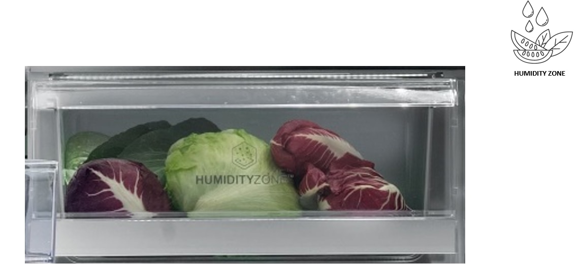 Iar in partea dreapta jos se mai afla un spatiu de depozitare cu umiditate redusa Dry Zone pentru depozitare de produse lactate, sortimente de branzeturi, mezelurilor si paste fainoase. Fluxul de aer care trece prin acest compartiment va determina scaderea umiditatii sub procent de 45% avand drept consecinta un mediu ideale pentru conservarea acestor alimente.
