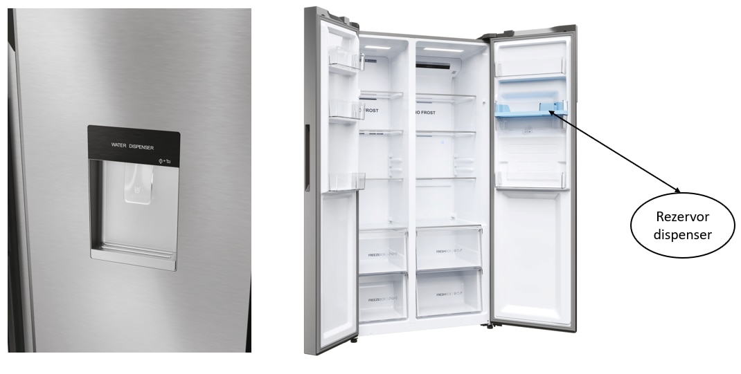 In plus usa frigiderului este dotata cu un dispenser de apa plata ce asigura apa rece si proaspata la o simpla apasare a clapetei, fara a fi necesara deschiderea usii. Pentru a optimiza spatiul interior rezervorul transparent cu capac Slim Tank de apa filtrata, cu o capacitate de 2 litri, este situat in interiorul frigiderului pe usa.