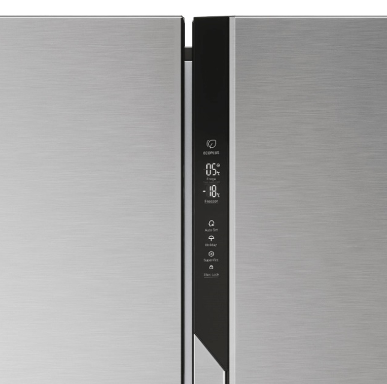 Panoul de comanda cu afisaj LED plasat in exteriorul aparatului frigorific pe usa, contin: Afisare temperatura in congelator; Afisare temperatura in frigider; Functia de Super Freezing; Functia de Super Cooling; Functia Vacanta; Functia de Economie de energie; Indicator avertizare pentru sectiune congelator; Semnal avertizare usa deschisa; Blocaj panou de comanda; Cu butonul Freezer puteti sa alegeti temperatura de congelare. Iar cu butonul Power Freezer activati functia de congelare rapida. Cu butonul Cooling alegeti temperatura de racire. Cu butonul Fridge activati functia de racire rapida. Ecranul LED are doua sectiuni unde se vor afisa temperatura din sectiunea de refrigerare si temperatura din zona de congelare. Astfel frigiderul ofera un interval de temperatura de racire cuprins intre 1°C si 9°C, in timp ce temperatura de racire din congelatorul de 4 stele poate varia intre -14°C si -24°C. Cu modul de setare Automat, temperatura din zona de refrigerare si de congelare se fixeaza in mod automat in functie de conditiile de mediu, din locul unde este plasat aparatul frigorific. Cand modul de functionare Automat este activat temperatura din frigider si din congelator nu pot fi selectate manual. Iar cand modul de functionare Automat este activat, daca sunt selectate functiile de: Racire rapida; Congelare rapida sau modul de Vacanta. Iar programul Child Lock permite blocarea comenzilor de pe panoul de comanda pentru a preveni activarea accidentala de catre copii in timp ce aparatul frigorific este in functiune. Copiii se pot juca langa aparat, fara ca sa fie supravegheati permanent. Panoul de comanda se activeaza: cand este pornita alimentarea aparatului, cand este atins un buton senzitiv sau cand este deschisa usa de la aparat. Pentru a face economie de energie panoul de comanda se dezactiveaza dupa un minut de la pornirea alimentari cu energie sau mai scurt dupa deshiderea usilor sau nu se mai executa nici o manevra cu aparatul. Daca apare o problema tehnica si aparatul frigorific nu functioneaza pe ecran va aparea un cod de eroare chiar si atunci cand nu este apasat niciun buton.