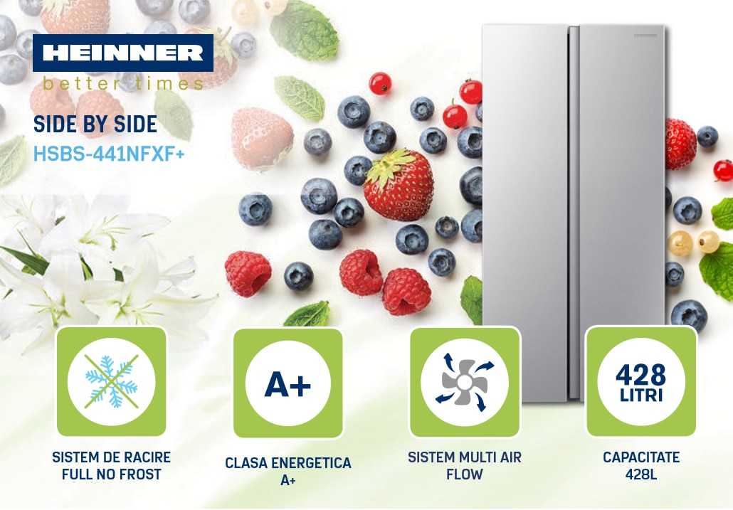 Side by Side HSBS-441NFXF+ este alegerea perfecta daca iti doresti o combina frigorifica de mari dimensiuni tot mai căutată în România, probabil datorită influenţei filmelor americane, fiind dotata cu cele mai noi tehnologii la un pret foarte bun. Design-ul acestei combine frigorifice cu suprafata usilor emailata de culoare argintie si laterale de culoare gri, potrivindu-se perfect in orice colt al casei tale.