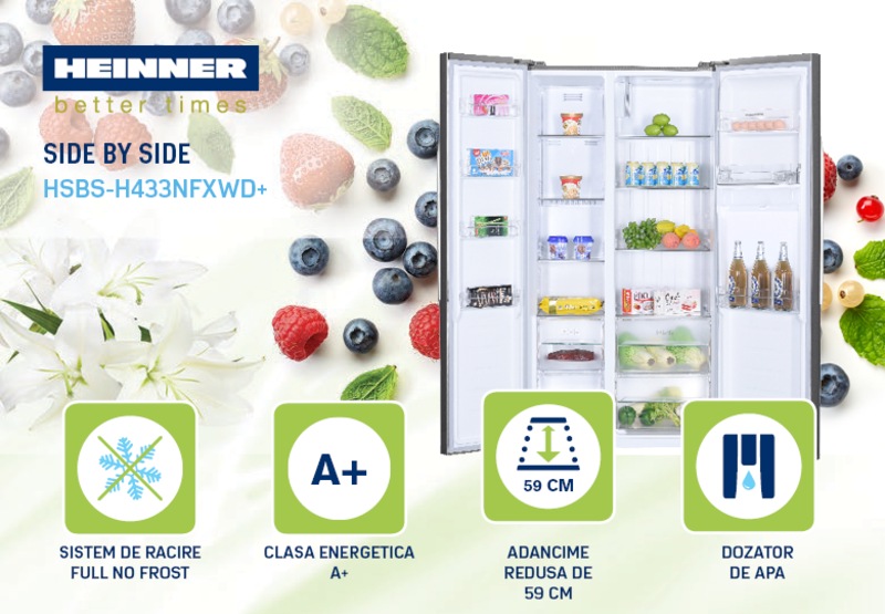 Side by Side HSBS-H433NFXWD+ este alegerea perfecta daca iti doresti o combina frigorifica de mari dimensiuni tot mai căutată în România, probabil datorită influenţei filmelor americane, fiind dotata cu cele mai noi tehnologii la un pret foarte bun. Design-ul acestei combine frigorifice cu suprafata usilor de culoare argintie, din otel inoxidabil anti-amprenta si laterale vopsite electro-static cu aspect de inox, potrivindu-se perfect in orice colt al casei tale. Afisajul LCD de dimensiuni generoase impreuna cu controlul electronic premium de tip touch control pozitiona in exteriorul combinei, monitorizeaza 2 zone de temperatură ce pot fi reglate independent, inlocuind cu brio clasicele butoane care devin din ce in ce mai demodate. Elementele de comanda ale aparatului contin: Afisare temperatura in congelator; Afisare temperatura in frigider; Functie de super-congelare; Functie de super-racire; Modul Smart; Modul ECO; Mod de Vacanta; Indicator avertizare pentru sectiune congelator; Semnal avertizare pentru defect; Semnal avertizare usa deschisa. Apasand butonul Freezer reglati temperatura in spatiul de refrigerare. Iar prin apasare butonului Fridge reglati temperatura in spatiul de congelare. Setarile independente pentru temperatura permite sa ajustam independent temperaturile din frigider si congelator in functie de nevoi. Frigiderul ofera un interval de temperatura de racire in spatiul de refrigerare cuprins intre 2°C si 8°C, in timp ce temperatura din congelator cu 4 stele poate varia intre -14°C si -25°C. Astfel prin apasarea butonului Mode aveti posibilitatea de a opta pentru functionarea: Smart; ECO; Super Cooling; Super Frost sau functionare Personalizata. In plus programul Child Lock permite blocarea comenzilor combinei pentru a preveni pornirea accidentala sau modificarea parametrilor de catre copii in timp ce combina este in functiune. Copiii se pot juca langa aparat, fara ca sa fie supravegheati permanent. Panoul de comanda se activeaza: cand este pornita alimentarea aparatului, cand este atins un buton senzitiv sau cand este deschisa usa de la combina. Pentru a face economie de energie panoul de comanda se dezactiveaza dupa un minut de la pornirea alimentari cu energie sau mai scurt dupa deshiderea usilor sau nu se mai executa nici o manevra cu aparatul. Pentru o functionalitate maxima aparatul datorita capacitati mari a frigiderului si a congelatorului a fost proiectat ca doua unitati independente cu un singur compresor de mare capacitate. Compartimentul de refrigerare si cel de congelare sunt una langa altul, pe verticala, complet separate, avand fiecare propria ei usa de acces. Au avantajul usilor de acces inguste, care nu incomodeaza mult cand sunt deschise. Heinner cu un singur compresor puternic prevazut cu o electrovalva, permite funcţionarea independenta a frigiderului si a congelatorului, fiind dotat cu tehnologii de varf, perfect pentru o familie numeroasa, cu diverse preferințe culinare. Combina frigorifica cu dezgheţare automată numai in zona de refrigerare, este construit astfel încât apa rezultată în urma dezgheţării se aduna într-un locaş special în partea de jos, de unde se scurge în afara frigiderului, într-o tăviţă aflată deasupra compresorului. De aici apa se evapora, ajutată fiind şi de căldura degajată de compresor în timpul funcţionării. In zona de refrigerare si de congelare la acest aparat cu ajutorul sistemului Smart Frost din dotare, acoperirea cu bruma a spatiului interior si a produselor congelate este redusa substantial, deoarece acest aparat regleaza temperatura automat in functie de temperatura interna si temperatura ambianta. Valorile temperaturi interioare fata de temperatura exterioara sunt date intr-un tabel in cartea tehnica a acestui aparat. Acest model are tehnologia de racire No Frost atat a frigiderului cat si a congelatorului. Aceasta tehnologie fiind una dintre cele mai bune sisteme de racire de pe piata, sistemul instalat in compartimentul congelatorului, previne acumularea de gheata, mentinand un consum scazut de energie, in timp ce in compartimentul frigiderului mentine un microclimat ideal pentru mancarea proaspata. In plus Heinner are in dotare si tehnologia de racire Multi Airflow, pe baza de curenti de aer multidirectionali pe mai multe canale, unde exista o grila prin care aerul rece pastrand temperatura si umiditatea constanta, intra prin mai multe orifici in compartimentul combinei. Aceasta tehnologie mentine calitatea si prospetimea alimentelor pentru o perioada indelungata. Comutatoarele de contact ale usii opresc ventilatorul la deschiderea acesteia. Acest model cu tehnologie de racire dinamica prin ventilare, cu aer rece cu umiditatea controlata, are un volum net generos pe frigider de 288 l precum și doua compartimente speciale pentru fructe si legume etc. Comutatoarele de contact ale usii opresc ventilatorul la deschiderea acesteia.