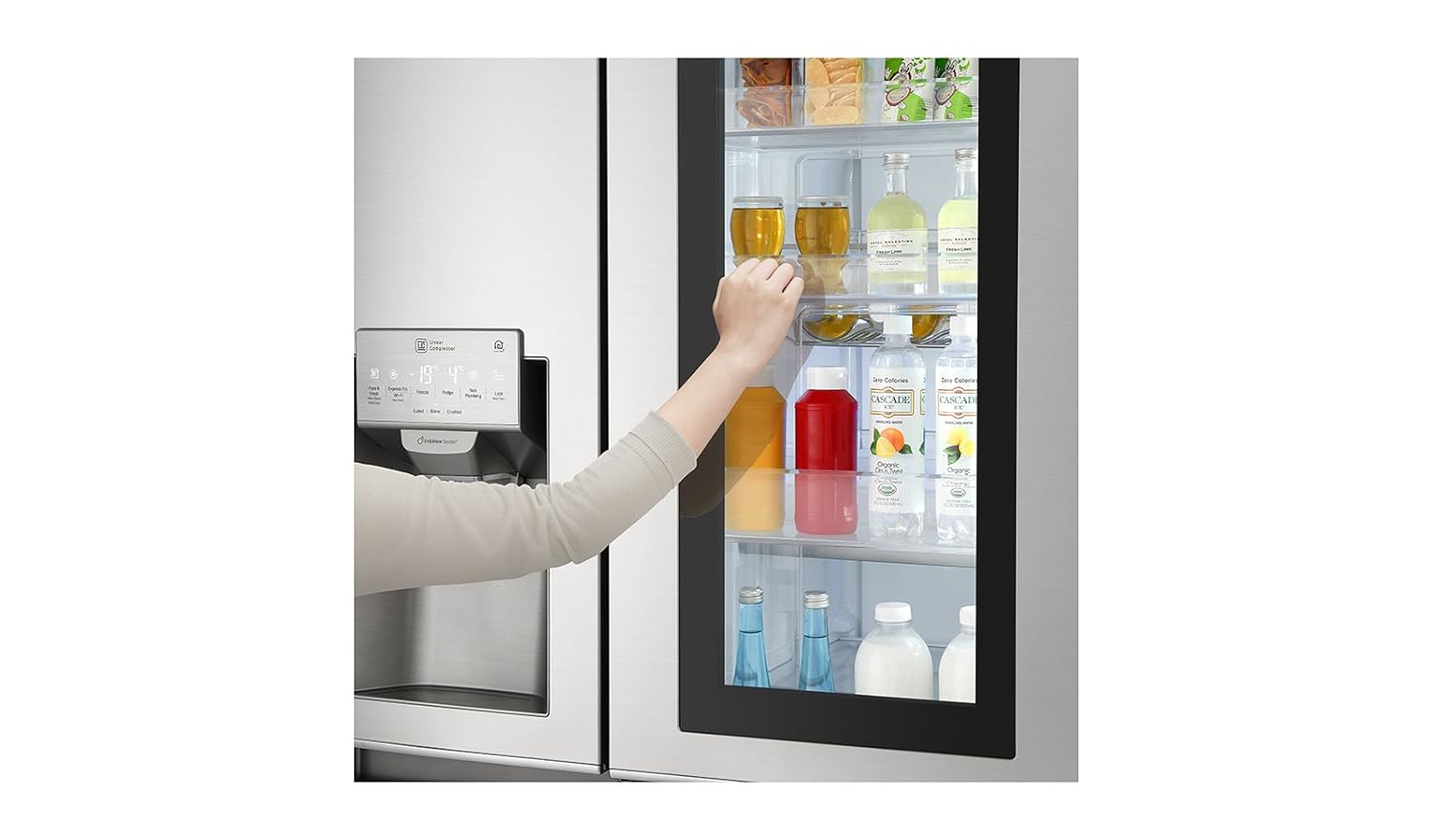 Deblocarea usi se face foarte simplu aplicand o serie de ciocanituri cu falangele degetelor de la mana, ce are rolul de a activa un senzor de vibratie, ce comanda deblocarea usi. Aceasta serie de ciocanituri are rolul si de a activa sistemul de iluminat al acestui spatiu. Blocare usi se face la fel cu o serie de ciocanituri pe geamul tip oglinda al acestui spatiu. Functia Insta View din spatiul Door-in-Door va permite sa vedeti fara a deschide usa daca produsele utilizate în mod frecvent, precum bauturile racoritoare sau berea, sunt pe cale sa se termine.