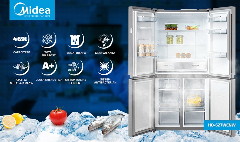 Midea cu un singur compresor si 2 circuite de racire separate este un aparat frigorific practic dotat cu tehnologii de varf fiind perfect pentru o familie numeroasa, cu diverse preferințe culinare. Alimentele isi pastreaza gustul si textura pentru mai mult timp datorita sistemelor independente de racire a aerului din frigider si din congelatorul fara gheata. Acest model cu tehnologie de racire dinamica prin ventilare, cu aer rece cu umiditatea controlata, are un volum net generos pe frigider de 327 l precum și 2 compartimente speciale pentru fructe si legume etc. Comutatoarele de contact ale usii opresc ventilatorul din zona de refrigerare la deschiderea acesteia.