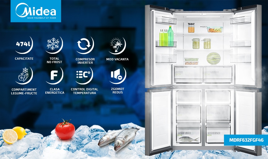 Side by Side Midea MDRF632FGF46 este alegerea perfecta daca iti doresti o combina frigorifica de mari dimensiuni dotata cu cele mai noi tehnologii la un pret foarte bun. Design-ul acestei combine frigorifice este unul foarte atragator ce iese in evidenta prin finisajele exterioare ale celor 4 usi cu suprafata din inox si a peretilor laterali emailati de aceeasi culoare, potrivindu-se perfect in orice colt al casei tale. Afisajul LCD de dimensiuni generoase impreuna cu controlul electronic premium de tip touch control pozitiona in afara aparatului pe usa, monitorizeaza 3 zone de temperatura ce pot fi reglate independent, inlocuind cu brio clasicele butoane care devin din ce in ce mai demodate. Elementele de comanda ale aparatului contin: Afisare temperatura in congelator; Afisare temperatura in frigider; Functie de Super-racire, Functia de super-congelare; Functia de Vacanta, Pictograma cu indicator de temperatura pentru fructe/legume/carne/bauturi; Modul Sabat; Indicator avertizare pentru sectiune congelator; Semnal avertizare pentru defect; Semnal avertizare usa deschisa; Semnal blocare butoane. Frigiderul ofera un interval cuprins intre -2°C si 8°C, in timp ce temperatura din congelator poate varia intre -16°C si -24°C. Programul Child Lock permite blocarea comenzilor combinei pentru a preveni pornirea accidentala sau modificarea parametrilor de catre copii in timp ce combina este in functiune. Copiii se pot juca langa aparat, fara ca sa fie supravegheati permanent.