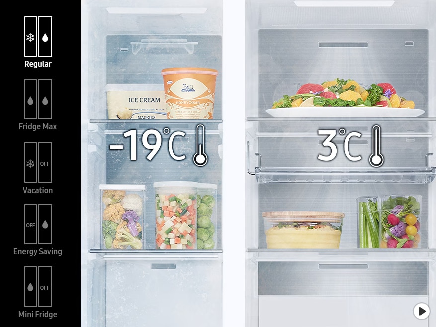 In plus prin functia Smart Control senzorii performanti transmit informatiile regimului termic al mediului exterior, ce pot controla regimul de racire din interior. Side by side Samsung Family Hub RS90F66BEFEO cu tehnologie de racire No Frost dinamica prin ventilare, cu aer rece, are un volum net generos pe frigider de 389 l precum și 2 compartimente speciale pentru fructe si legume etc. Comutatoarele de contact ale usii opresc ventilatorul la deschiderea acesteia.