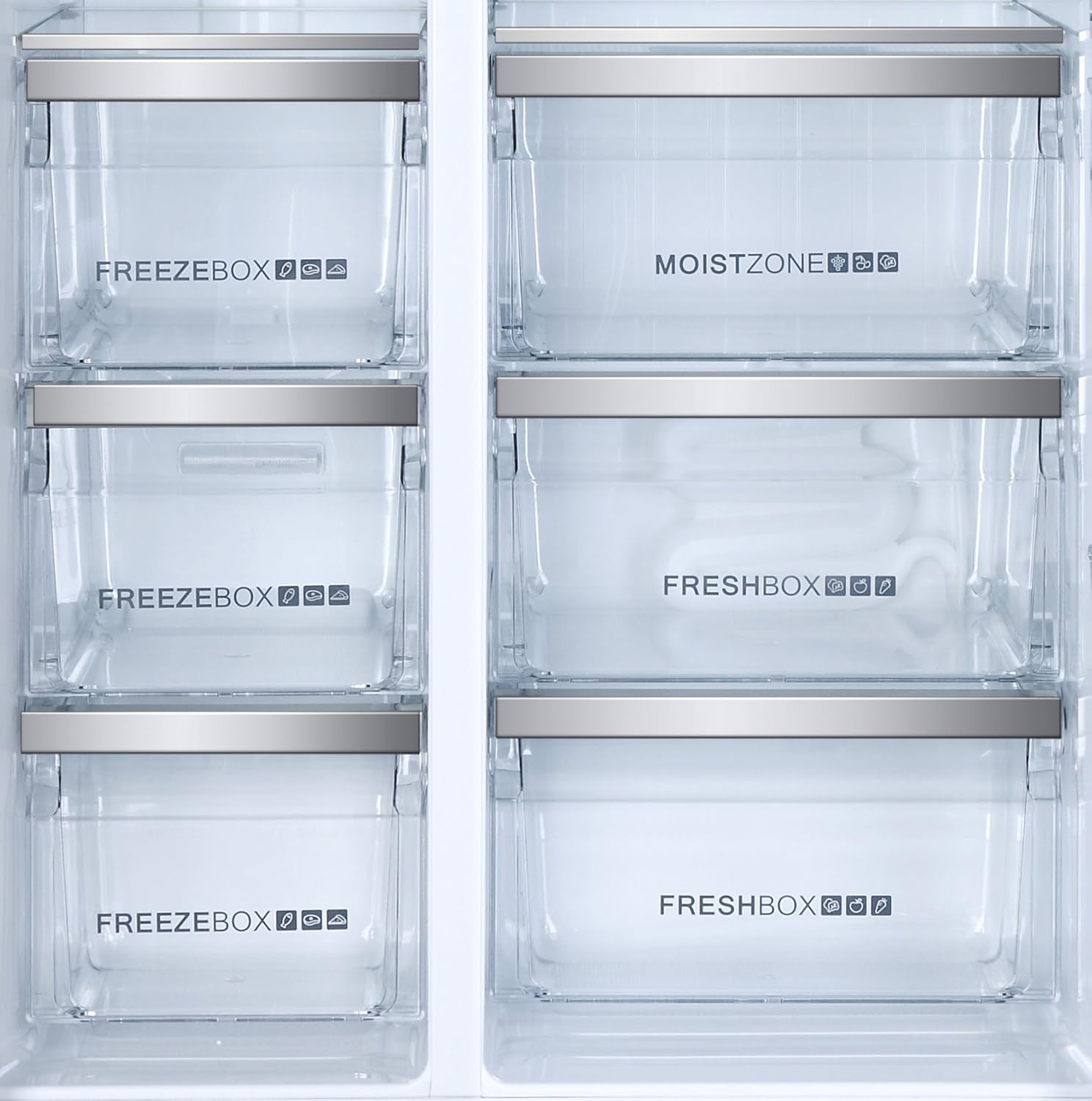 Pentru o functionalitate maxima aparatul datorita capacitati mari a frigiderului si a congelatorului a fost proiectat ca doua unitati independente cu un singur compresor de mare capacitate. Compartimentul de refrigerare şi cel de congelare sunt una lângă alta, pe verticală, complet separate, având fiecare propria ei uşă de acces. Au avantajul uşilor de acces înguste, care nu incomodează mult când sunt deschise. Pe aceasta combina nu va trebui niciodată sa o dezghetati manual datorita tehnologiei de racire Total No Frost, care stopeaza inghetarea interioara. Side by Side Haier HRF-630AM7 cu un singur compresor puternic prevăzut cu o electrovalvă, permite funcţionarea independentă a frigiderului şi a congelatorului, fiind dotat cu tehnologii de varf, perfect pentru o familie numeroasa, cu diverse preferințe culinare. Controlul precis si individual al temperaturii pentru compartimentul de refrigerare si compartimentul de congelare al combinei frigorifice Haier este obtinut prin sistemul Duo Cooling prezent la acest model cu doua circuite de racire reglabile complet separat. In plus, cu sistemul Duo Cooling se elimina transferul mirosurilor si se opreste deshidratarea produselor depozitate, nu exista posibilitatea ca aerul sa circule intre compartimentul de refrigerare si cel de congelare.