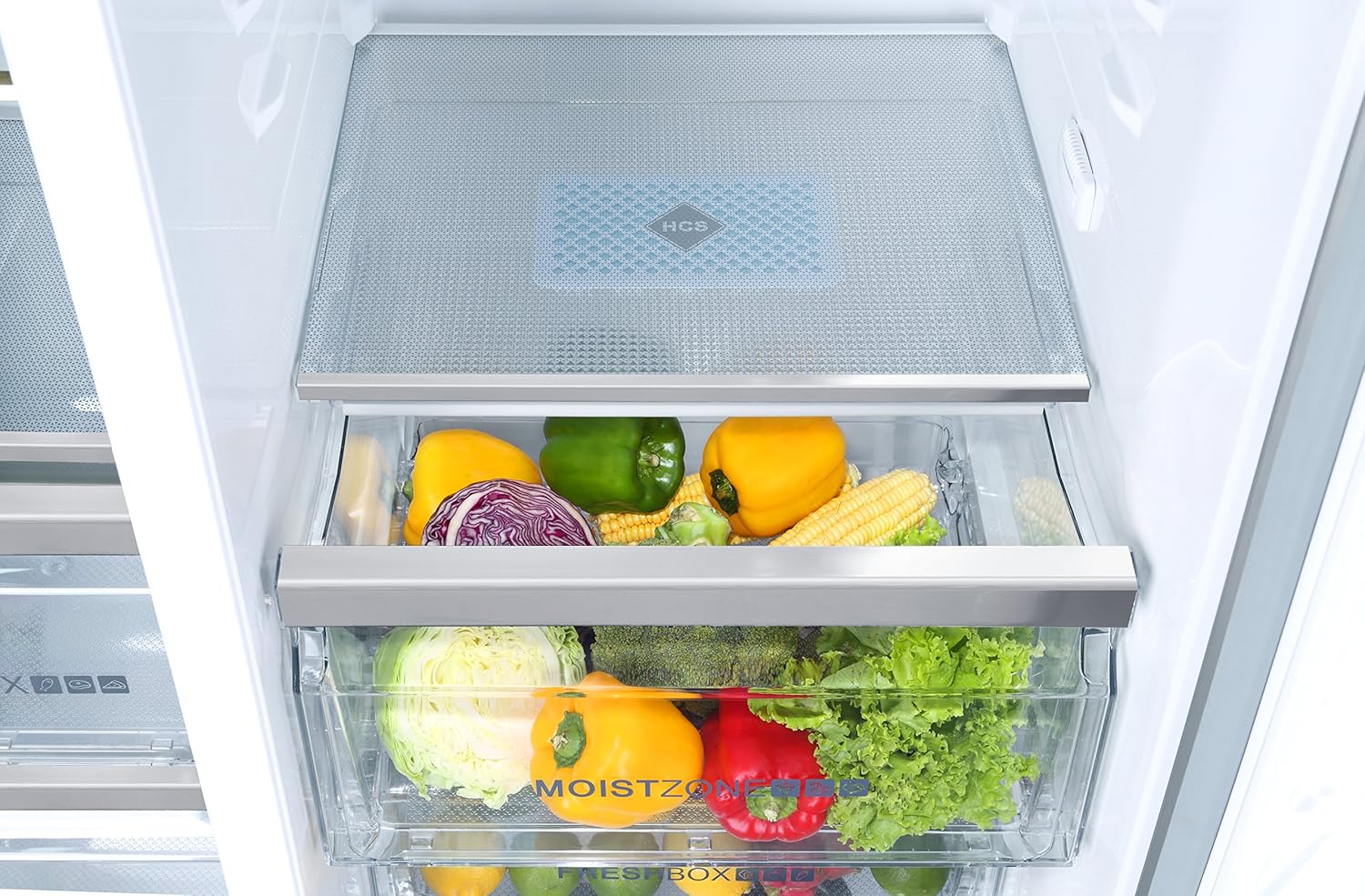 Comutatoarele de contact ale usii opresc ventilatorul la deschiderea acesteia. Rafturile de depozitare alimente in frigider sunt in numar de 4 in corpul din dreapta realizate din sticla termorezistenta cu sistem anti-alunecare format dintr-o margine din inox, ce se curata usor si au o rezistenta foarte buna la greutati mari. Poti plasa recipiente grele, de pana la 25 de kg, pe orice raft. Un mare avantaj al acestui model este ca pozitia rafturilor poate fi ajustata dupa nevoi în trepte de maximum cativa centimetri. Acest lucru este util deoarece se intampla frecvent ca aceasta distanta sa fie cu cativa milimetri mai mica decat inaltimea standard a vaselor sau a borcanelor din comert. In partea inferioara a frigiderului se afla compartimentul Vegetable Box etans cu 2 sertare pe sine, de depozitare al legumelor si fructelor. In aceasta zona temperatura este pastrata in limitele de (0°C ~ 5°C). Garnitura de silicon și sistemul de degazare al compartimentului etans V-Prospetime menține nivelul de umiditate corect și temperatura stabilă, pentru o prospeţime mai ridicată, decât legumele stocate intr-un compartiment convențional. Umezeala din alimentele stocate este evaporată şi apoi condensată de această structură specială, menţinând nivelul corect de umiditate în cutie. Deasupra acestei zone se afla un spatiu Moist Zone de prospetime etans de asemenea dedicat depozitarii alimentelor proaspete, cu temperatura de 0°C. Acest spatiu de prospetime mai poate fi folosit si pentru a decongela alimentele scoase din congelator pentru a fi procesate imediat