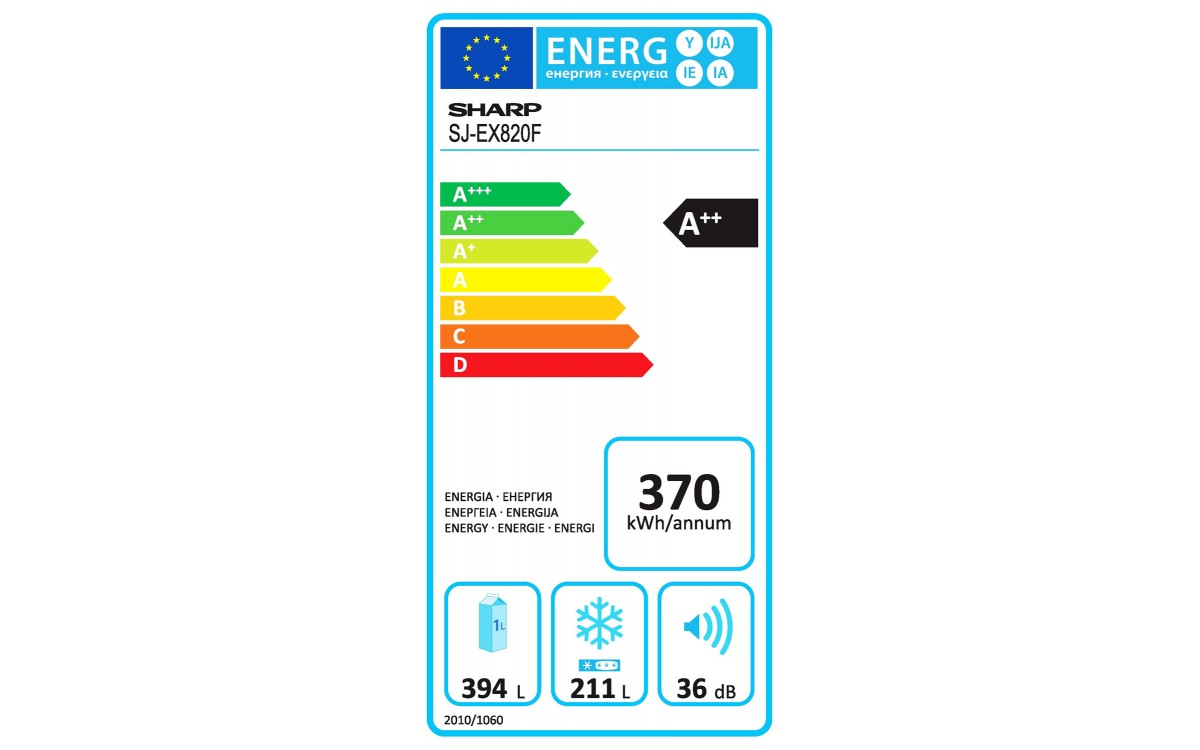 Eficienta energetica oferita de Combina frigorifica Sharp SJEX820FWH este foarte buna, avand clasa A++, cu un consum anual de energie de 370 kWh/an, si un consum zilnic de energie de 1 kWh/zi.