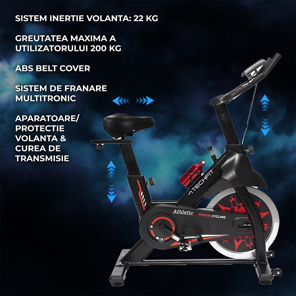 Bicicleta de spining Techfit Athletic din punct de vedere tehnologic este dotat cu o volanta cu aparatoare, avand un diametru de 60 cm, cu o greutate de 20 kg si cu momentul de inertie cinetica de 22 Kg, care determina miscarea dispozitivului de antrenament. Rolul volantei este de a asigura o miscare cat mai lina datorita inertiei, iar efectele se vor resimti asupra organismului, protejand articulatiile, cat si asupra aparatului in sine, care va avea o durata de viata mai lunga.