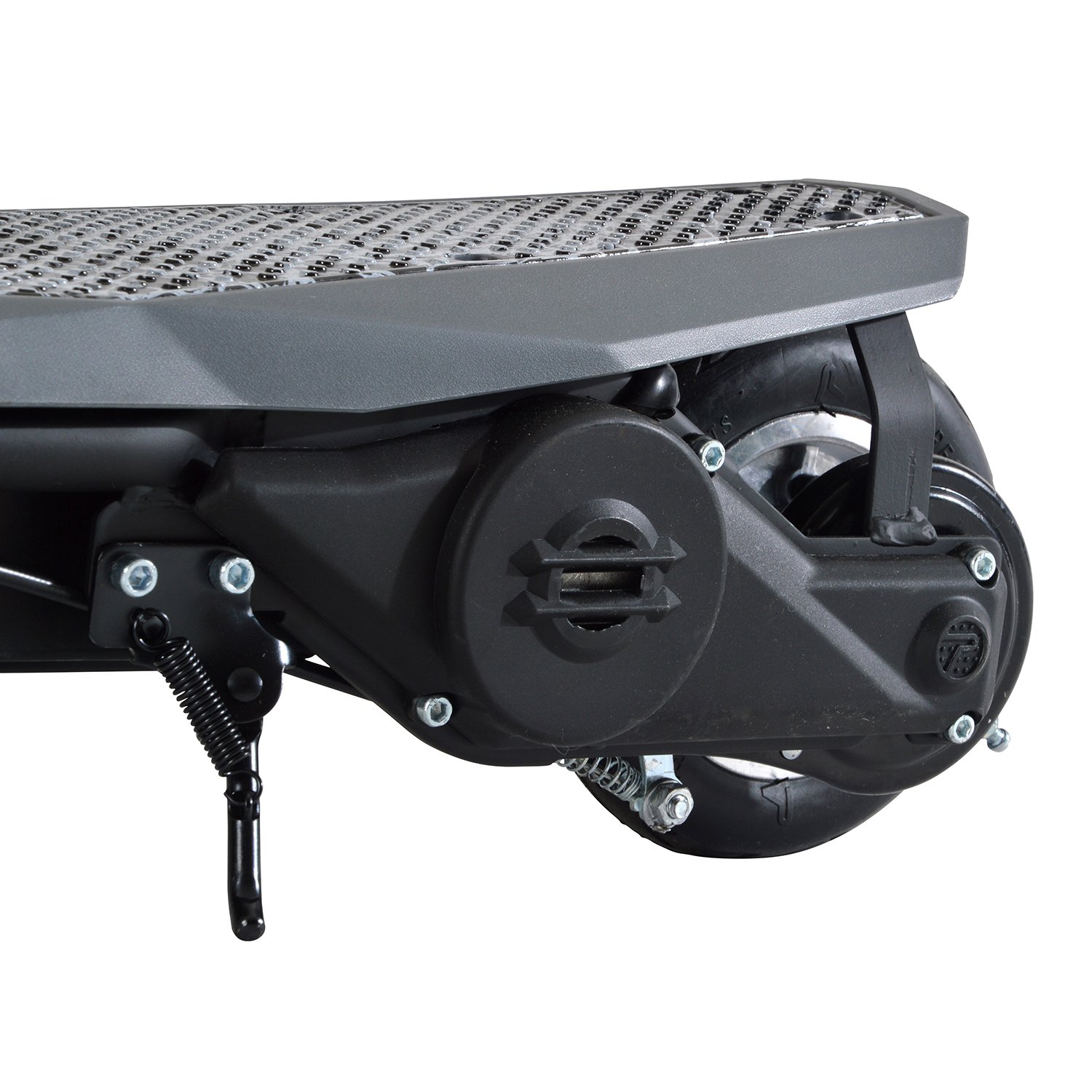 Sistemul de franare la mana cu actionare din ghidon de pe partea stanga, actioneaza sabotul de franare pe disc cu care este echipata roata din spate. Actionarea franei se face, desigur, cu ajutorul unui cablu. Acest sistem de franare are si un intrerupător electric care opreste alimentarea motorului cand este apasata maneta de frana. Cu aceste dotari, frana functioneaza bine, este foarte rezistenta si franeaza roata aproape instantaneu la orice viteza cu care se deplaseaza vehicolul. Sasiul trotinetei care are o distanta fata de sol de 14 cm, este dotat si cu o platforma antiderapanta ce ne permite o echilibrare si o priza mai buna la picioare.