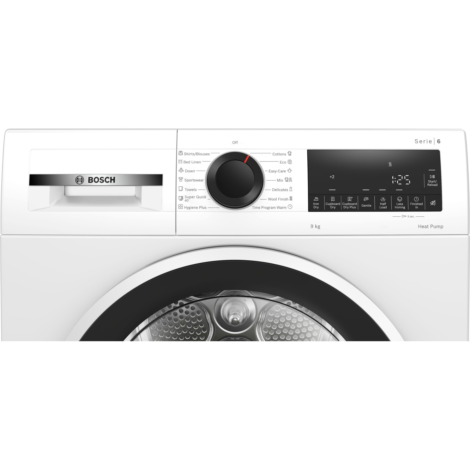 Uscatorul de rufe Bosch WQG243DMBY are un design a carcasei de culoare alb lotus.