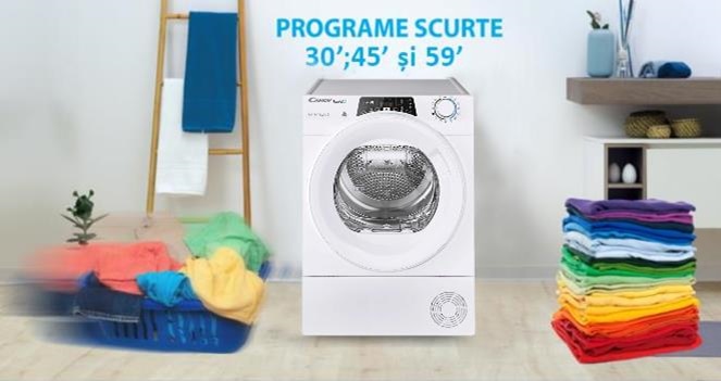 Atunci cand vremea este nefavorabila hainele intinse la uscat pe balcon se usuca foarte greu, plus ca ridica gradul de umezeala din casa ce genereaza o atmosfera nesanatoasa si plina de sporii de mucegai. Uscatorul de rufe reprezinta, asadar, singura solutie care nu depinde de prognoza meteorologica. Prin controlul precis al temperaturii si al timpului de expunere uscatorul are grija de textura rufelor. Acest model este produsa in Italia de specialisti italieni din Brugherio (MB). Astfel brand-ul Candy este recunoscut in lume, cu o cota de piata din ce in ce mai importanta, mai ales pe segmentul de electrocasnice. Uscatorul dotat cu pompa de caldura si facuta de specialisti italieni, este o optiune pentru o astfel de solicitare. Astfel uscatorul de rufe Candy Rapido ROE H8A2TE-S si cu o capacitate de uscare de 8 Kg îndeplineste o mare dorinţă: aceea de a reuşi să usuce rufele în scurt timp, eliminând spaţiul ocupat de suportul de întins rufe. Cu ajutorul programelor speciale, capabile sa trateze chiar si rufele cele mai delicate, uscatorul stie sa aiba grija de tesaturii. Senzorii speciali permit maşinii de uscat rufe să măsoare umiditatea reziduală din haine şi să se oprească automat la atingerea nivelul corespunzător. Design-ul special al peretilor laterali ai masinii de uscat reduc foarte mult zgomotul si nivelul vibratiilor in timpul uscari. Uscatorul de rufe Candy Rapido ROE H8A2TE-S avand si un motorul Pro Smart Inverter fara perii cu puterea de 120 W, asigura o functionare ultra-silentioasa de 67 dB la uscare ridicandu-se la cele mai ridicate standarde de eficienta energetica. Acest tip de motor brushless, a caror constructie a permis eliminarea periilor de carbon, introduce un set de avantaje sesizabile de la prima utilizare: nivel de zgomot redus, absenta vibratiilor, control imbunatatit al turatiei, eliminarea emisiilor electromagnetice. Toate aceste avantaje sunt dublate de durabilitatea si robustetea ansamblului din care au fost eliminate elementele supuse uzurii, periile de carbon. Acest motor fiind proiectat tehnologic pentru a beneficia de durabilitate maxima in utilizare. Acest uscător cu motor Inverter, din gama profesională de la Candy, are si zece ani garanţie. Tehnologia inovativa a acestui model cu pompa de caldura este o combinatie intre un uscator in condensatie si o pompa de caldura. Sistemul pompei de caldura, genereaza aer fierbinte ce usuca rufele prin condensare, unde apa reziduala din rufe este transformata in abur care este colectat si transformat din nou in condens colectat intr-un recipient de colectare special plasat pe uscător. Cu acest sistem de condensare de la Candy, condensul rezultat in urma procesului de uscare, se acumuleaza intr-un recipient transparent, incorporat in usa de acces a uscatorului, pe care il poti goli periodic foarte usor. Astfel aceasta tehnologie din dotare Easy Case iti da posibilitatea de a verifica in orice moment nivelul de condes colectat in acest rezervor transparent.