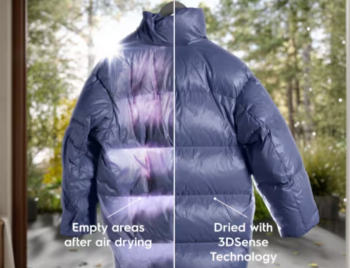 Uscatorul cu eficienta de condensare de 91% are in dotare un rezervor de colectare condens cu capacitatea de 5,56 litri, cu furtun de evacuare direct. Sistemul de uscare 3D Sense a carui tehnologie usuca hainele la o temperatura redusa fata de uscarea conventionala in aer liber, usuca jachetele sau pilotele cu umplutura de puf sau cu pene, pentru a detecta in profunzime umiditatea, pastrand-ule pufoase si calduroase in proportie de 100%. Acest rezultat de uscare a fost obtinut in urma unui text realizat conform standardului ISO 11092.