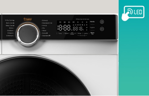 Panoul de comanda digital si mecanic situat in partea superioara este prevazut cu un ecran LED fiind actionat de un buton rotativ si de butoane touch- control, unde putem sa vizualizam urmatoarele functii: Pornire temporizata; Blocare actionari; Indicator timp ramas/Mesaj de eroare; Stadiul ciclului de uscare; Atentionare pentru curatarea filtrului; Nivel maxim rezervor de condens; Nivelul de uscare; Indicator de iluminare cuva; Indicator sonor; Functia de anti-sifonare. Iar grila formata din cele 14 programe de uscare este usor de accesat si intuitiva si cuprinde majoritatea optiunilor disponibile de uscat. In jurul butonului rotativ de selectie exista pictograme sugestive pentru fiecare tip de program de uscare, iar cu ajutorul actionarilor putem face orice modificari ale parametrilor implicati in ciclul de uscare. Butoanele pentru accesarea functiilor speciale sunt: (Delay Timmer, Time, Intensity, Lamp, Signal, Anti-Crease si Child lock. Cu butonul Delay Timmer puteti programa selectand durata de temporizare de pana la 12 ore. În cazul selectarii functiei Time, timpul de uscare se poate modifica in pasi de 10 min. Durata maxima este de 150 de minute. Functia Intensity este folosita pentru a intensifica procesul de uscare prin reducerea duratei de uscare. Aceasta functie se poate activa inainte de a porni programul de uscare selectat. Iar nivelul de uscare se poate selecta prin apasari succesive a butonului. Aceasta functie poate fi aplicata la toate programele cu exceptia programelor: Tyme Dry; Refresh si Woll sau Delicat. Activand functia Lamp sistemul de iluminare al cuvei sta aprins 3 minute de la accesarea functiei sau un minut de la deschiderea usi. Functia Signal activeaza sau dezactiveaza semnalul sonor ce ne anunta de finalizarea procesului de uscare. Accesand functia Anti-Crease la finalul unui program de uscare, functia anti-sifonare va fi activata pana la maxim 120 de minute. In acest scop cuva executa miscari periodice. La functia Silence Dry viteza de rotatie a tamburului va scadea pentru a reduce zgomotul uscatorului, dar in schimb durata de uscare se va mari. La acest uscator nivelul de umiditate poate fi modificat in doua trepte. Dupa selectie, se va aprinde LED-ul corespunzator nivelului de uscare accesat. Cu ajutorul functiei Buzzer ai optiunea setarii intensitatii volumului semnalului sonor ce indica finalizarea programului de uscare, sau de a-l dezactiva, in functie de preferinte. Programul de uscare este posibil sa fie schimbat pana la 10 minute dupa inceperea programului. Pentru a realiza acest lucru comutam uscatorul in modul Pauza in timpul unui program de uscare, apasand butonul “Pornire/Pauza” iar pe display un indicator ne va indica etapa in care a ajuns ciclul de uscare. De asemenea, cand usa de serviciu este gata să fie deschisa, un indicator va semnaliza permitand sa scoatem sau sa adaugam rufe in uscator. In plus putem face eventuale modificari ale functiilor auxiliare, ale temperaturii si a nivelului de uscare, daca este necesar, unde durata poate fi recalculata si adaptata la noul curs al programului. Pentru a reporni programul de uscare apasam in continuare pe acelasi buton “Pornire/Pauza”. Modificarile in programul de uscare vor fi facute cu conditia sa fie adecvate programului respectiv, care aflat in derulare nu a fost inca finalizat. Pentru a schimba setarile programului in derulare se apasa pe butonul “Start/Pauza” si programul se opreste. In continuare schimbati setarile din program si apasati din nou pe acelasi buton. Acest uscator fiind proiectat pentru o functionare indelungata pe afisaj vor aparea si coduri de eroare. In acest sens cu functia de Diagnosticare Inteligenta din dotarea acest model are rolul de a preveni defectiunile severe care pot sa apara. Aceasta functie va identifica inca din faza incipienta orice eroare aparuta in regimul normal de functionare si va opri instantaneu uscatorul, afisand in acelasi timp pe display-ul acesteia un cod specific fiecarei erori. In functie de aceste coduri afisate ce sunt prezentate si in manualul uscatorului, veti putea gasi cele mai rapide si mai sigure metode de remediere. Programul Child Lock permite blocarea butoanelor uscatorului pentru a preveni oprirea accidentala sau schimbarea programului. Copiii se pot juca langa uscator, fara ca sa fie supravegheati permanent. Aceasta functie se poate activa sau dezactiva apasand concomitent timp de 3 secunde butoanele Delay si Lamp.