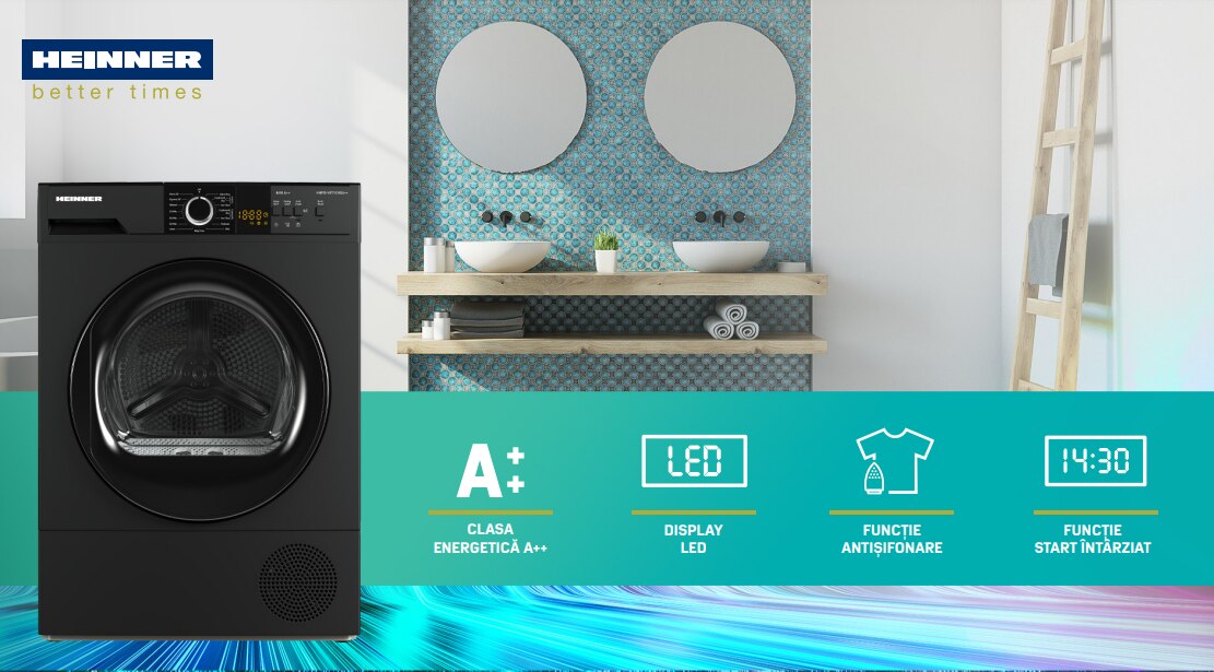 Cuva masini cu sistem de iluminare este facuta dintr-un material termorezistent polipropilena de culoare antracit iar tamburul este din otel inox. La acest model de la Heinner, tot procesul de uscare al rufelor se face prin condensare, apa fiind colectata in cadrul unui rezervor cu indicator de nivel, avand capacitatea de 5 litri care trebuie golit la o anumita perioada de timp. Dimensiunea mare a usii si hubloului cu diametrul de 37,5 cm. ofera usurinta si lejeritate crescuta in manuirea articolelor foarte mari paturi si pilote.