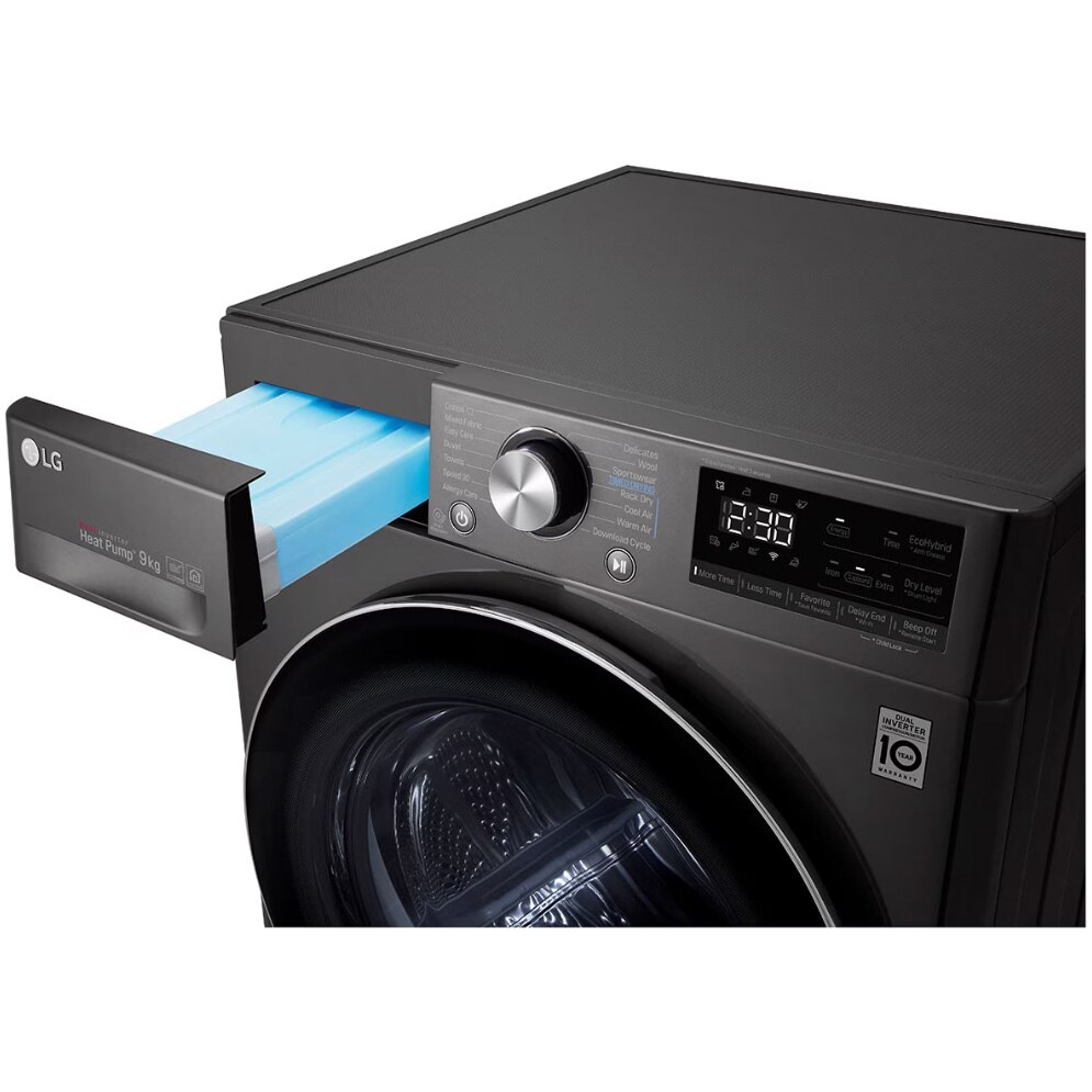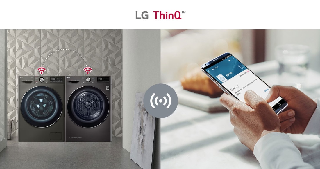 Cu ajutorul tehnologiei WI-FI, utilizatorul poate folosi acest program pentru a accesa functiile de uscare, precum si pornirea/oprirea aparatului prin intermediul aplicatiei Wi-Fi ce se poate instala la acest model. Prin intermediului aplicatiei Wi-Fi puteti controla uscatorul de oriunde va aflati, folosind propriul smart phone. In plus cu ajutorul tehnologiei NFC tagging, utilizatorul poate descarca noi programe de uscare, precum cele pentru Bumbac, Lana etc. Apoi, pot folosi aceste programe prin simpla atingere a telefonului de simbolul NFC Tag On de pe masina de uscat. Acest model are in dotare si tehnologia Smart Diagnosis cu aplicatia de control LG Smart ThinQ pentru diagnosticarea și remedierea rapida si corecta a oricaror probleme pe care le puteti avea cu uscatorul de rufe sau daca ai si o masina de spalat rufe de la LG. Aceasta noua aplicatie nu asigura numai depanarea, ci prezinta si starea de intretinere si sfaturi generale direct cu ajutorul telefonului la centrul de service LG. Acest lucru va ofera posibilitatea de a discuta direct cu specialisti de la LG pentru a analiza problema aparuta, oferind astfel un diagnostic competent. Iar cu ajutorul unui telefon inteligent compatibil cu aplicatia LG Smart ThinQ™, poti regla setarile de la distanta, pentru ca acest uscator sa functioneze cand te intorci acasa. Uscatorul suporta numai retele Wi-Fi de minim 2,4 GHz. Toate aceste operatiuni complexe sunt explicate pe larg in cartea tehnica a uscatorului.