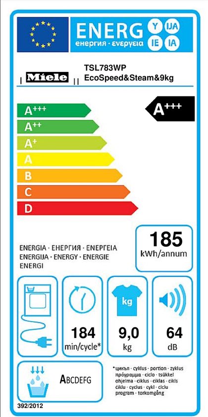 Avem de-a face cu un uscator economic si din punct de vedere al consumului de resurse energetice, din acest punct de vedere Miele TSL783WP EU1 LW cu puterea instalata de 1100 W fiind incadrata in clasa de eficienta energetica A+++. Programul de uscare Bumbac are un consum energetic de 1,55 kW/h in cazul programului standard cu incarcatura completa si cu durata de 184 minute. Iar consumul de energie in programul de uscare bumbac la sarcina partiala cu durata de 108 minute, este de 0,84 kWh. Consumul mediu anual de energie al uscatorului este de 185 kWh/an.